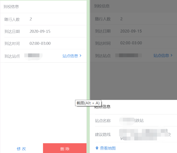 6、学生点击到站登记服务,可在页面中登记自己前往学校所达到的火车站等信息,便于学校进行及时掌握同学们的到站时间,安排相应的车辆前去迎接或自行搭乘交通工具达到学校,如下图所示: