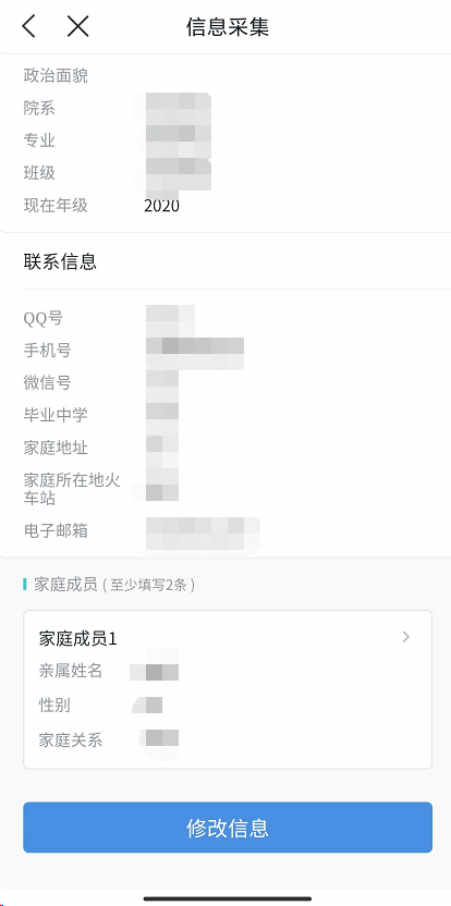 3、点击信息采集服务项,可进入学生详细信息界面,包括学生基本信息、联系信息、其它信息、父母信息等,其中带红色星号的字段为必须填写的信息,滑动到最底部点击修改信息按钮开始完善个人信息,最后点击提交按钮提交信息,如下图所示: