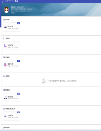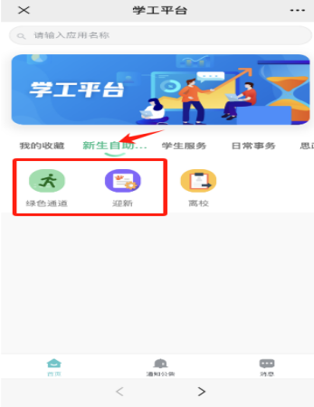 (一)登录成功后,选择界面“新生自助服务”栏,在页面上找到【迎新】【绿色通道】应用。
