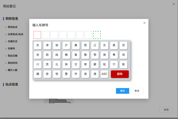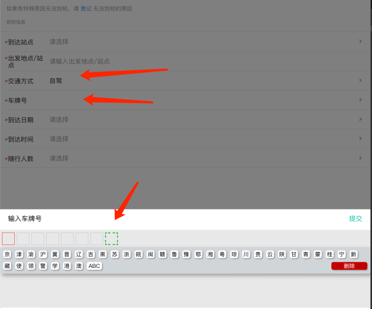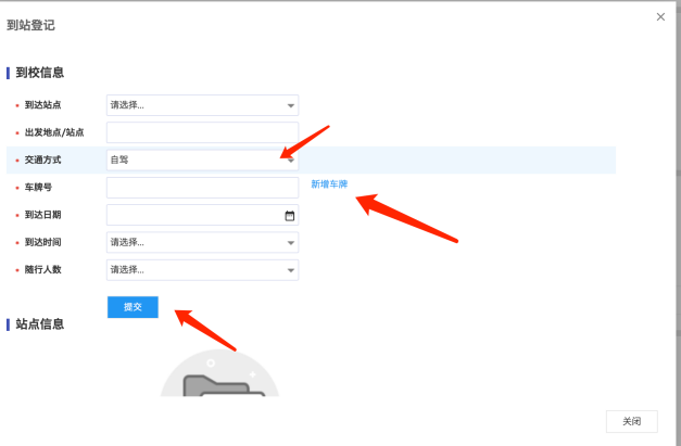 5、学生点击到站登记服务,可在页面中登记自己前往学校所达到的火车站等信息,便于学校进行及时掌握同学们的到站时间,安排相应的车辆前去迎接或自行搭乘交通工具达到学校,如果选择自驾来校,请正确填写车牌号,如下图所示: