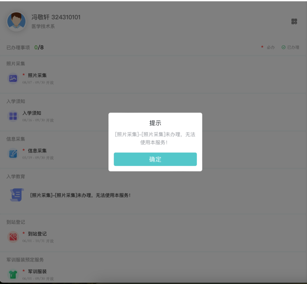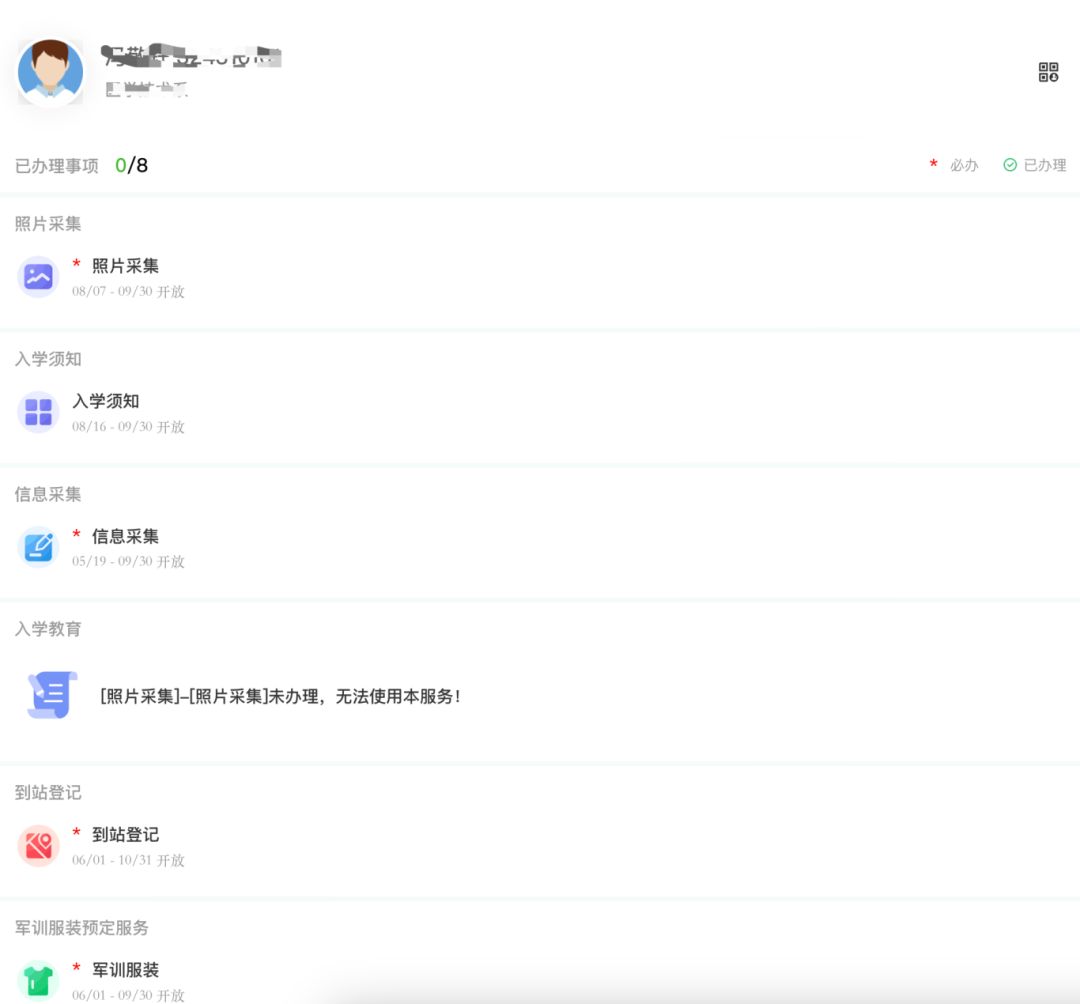 1、学生进入迎新服务后在页面上会看到照片采集、入学须知、信息采集、入学教育、到站登记、军训服装、财务缴费、报到单八个学生自助服务项,八个自助服务项需按顺序逐一填写。如下图所示: