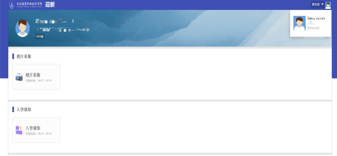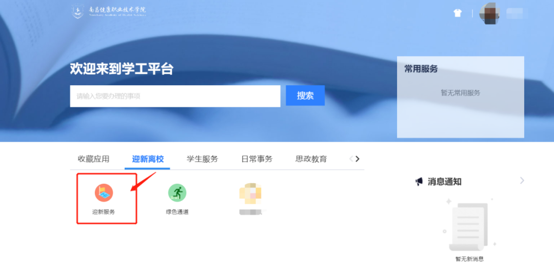1、学生输入账号和密码登陆成功之后即可进入到首页,点击迎新服务模块即可进入迎新流程办理环节。如下图所示:
