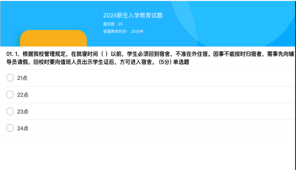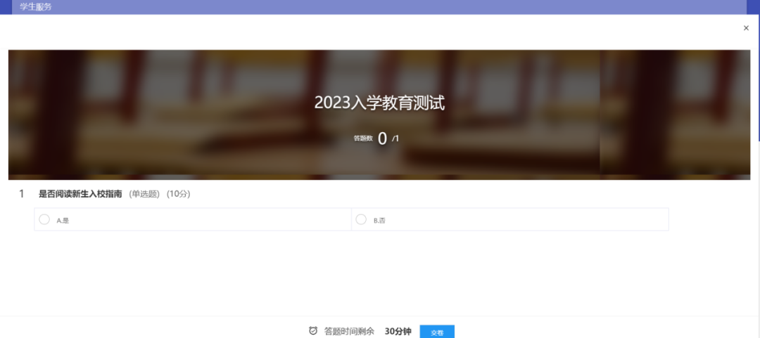 4、点击入学教育测试服务,每天有3次答题的机会,通过后不能继续答题,点击开始答题可进入答题环节,如下图所示: