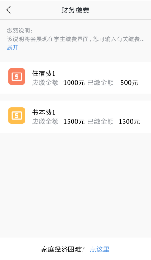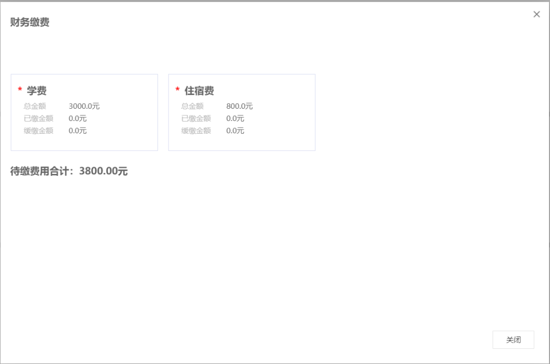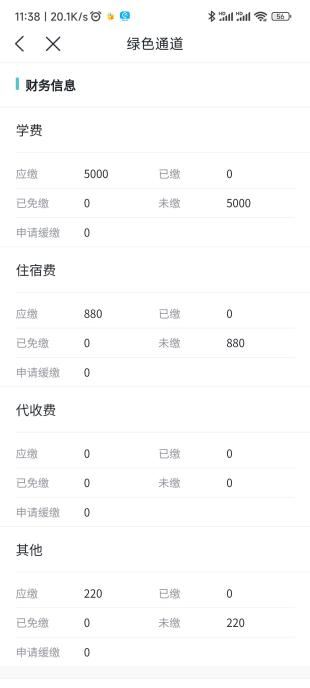 7、学生点击财务缴服务,进入财务缴费页面可实时查看自己应缴费用项目和缴费状态等信息,如下图所示: