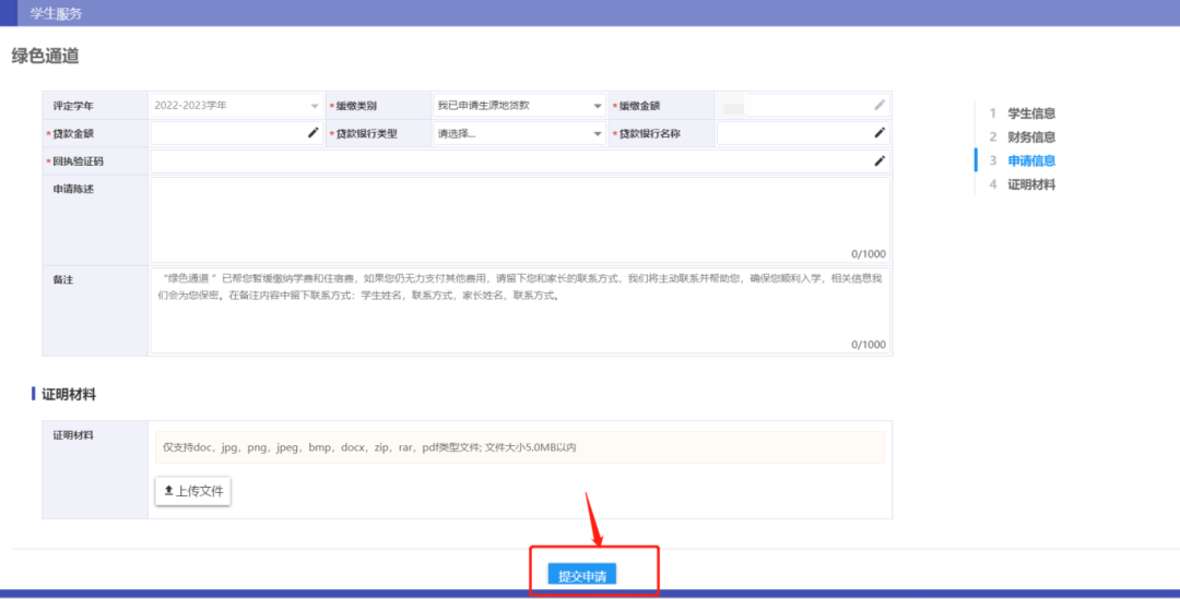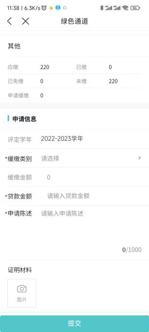 9、有需要办理绿色通道可点击【绿色通道】服务,学生可在该界面申请绿色通道,上传证明材料,申请“我已申请生源地贷款”的学生须填写生源地贷款回执码并上传贷款合同照片,申请“缓缴学费”的学生须按照下方文字格式进行编写陈述理由进行申请,学生绿色通道申请后需要学院管理员进行审核,如学生不需要办理此项业务可直接跳过。
