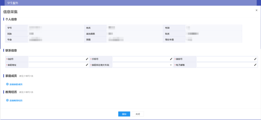 4、学生点击信息采集服务项,可进入学生详细信息界面,包括学生基本信息、联系信息、其它信息、父母信息等,其中带红色星号的字段为必须填写的信息,完善个人信息后,点击保存按钮提交信息,如下图所示: