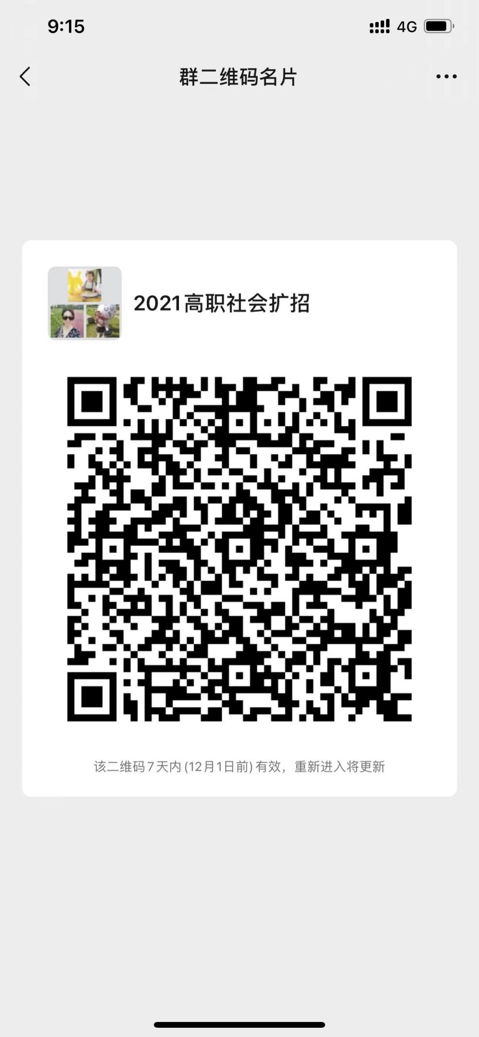 由于疫情影响,经我院研究决定,高职社会扩招采用线上测试,为了便于组织考试及考生了解招生信息,我院建立了高职社会扩招微信群。由于部分考生电话有误,无法通知加群,请还未加群的考生自行扫码进群,进群请备注“2021社会扩招 姓名”。