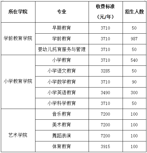 我校是国家教育部职业教育院校教育教学指导委员会学前教育和小学教育两个专业委员会的成员单位,当选专委会委员2名。2018年,学前教育专业被省教育厅批准确定为全省高职高专50个优势专业之一。 2023年我校被评为江西省第二轮“双高校”高水平专业群建设计划建设单位,小学教育、学前教育专业群成功立项江西省省级高水平专业群。 我校学前教育(三年制)、小学教育专业(三年制)、小学英语教育专业、小学科学教育专业已成功纳入教育部师范生免试认定教师资格改革范围。 学校教学成果显著,注重教育科研与教学实际相结合,“以赛促教,以教促学”。近年来,学前教育和英语教育两支学生团队参加全国技能竞赛获团体、个人二等奖;2项教学科研成果获省级职业教育教学成果二等奖;省级精品在线开放课程6门;在第十二届“挑战杯”江西省大学生创业大赛中,获五项铜奖;连续三年获得全省高校大合唱比赛高职高专组二等奖;全省定向越野比赛中,学生团体总分第二;学校连年获得上饶市“文明单位”“文明校园”称号;教师团队参加江西省职业院校技能大赛教学能力比赛(高职组)荣获一等奖,全国比赛荣获二等奖;成立了全国首个乡村教育振兴博士工作站,成立了上饶市护蕾家庭教育指导中心;两个案例分别入选江西省 2022 年度教育评价改革优秀案例和江西省2022年度可复制、可推广优秀实习管理案例。 学校面向安徽、浙江、上海、福建、江西、山东、山西、河北、河南、山西、陕西、黑龙江、吉林、辽宁、湖北、湖南、广东、广西、重庆、四川、云南、贵州、甘肃、宁夏24个省(市、区)招生。学校历来高度重视毕业生就业工作,通过校园招聘、校企联合、访企拓岗等多种方式为每一位毕业生提供推荐优质就业岗位、创造就业机会,我校各专业对口率达到80%以上。二、招生专业、招生人数及收费标准