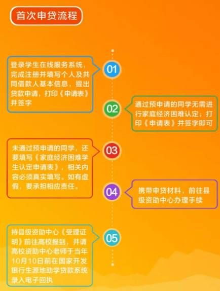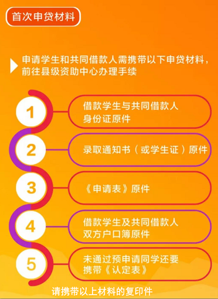在网上通过预申请后,打印《申请表》并签字确认,学生和共同借款人持《申请表》、高校录取通知书、学生和共同借款人的身份证和户口簿原件及上述材料复印件到户籍所在县(市、区)教育局资助中心办理。持县级资助中心《受理证明》前往高校报到。
