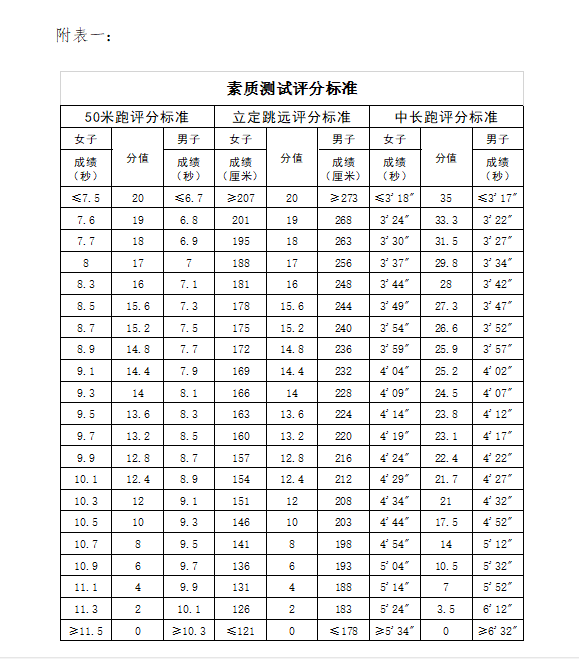 测试要求:采用站立式起跑,起跑两个口令“各就位-鸣枪”,不分道跑。因场地原因,不得穿钉鞋。