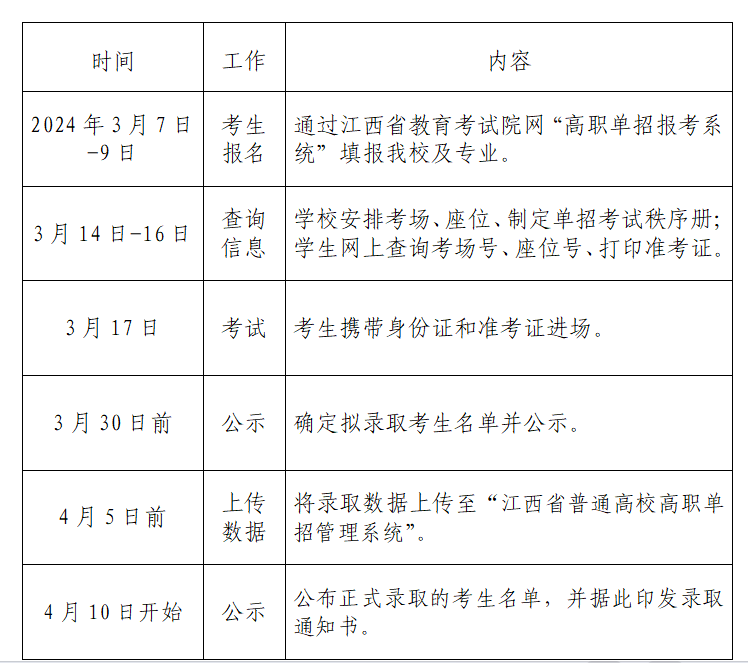 3月7日9:00-9日17:00期间,考生自行登录江西省教育考试院网(网址:www.jxeea.cn)“高职单招报考系统”填报吉安幼儿师范高等专科学校(报考代码:8679),签订《江西省2024年高职单招考生诚信报考承诺书》,承诺被高职单招录取后不再参加2024年6月举行的统一高考。