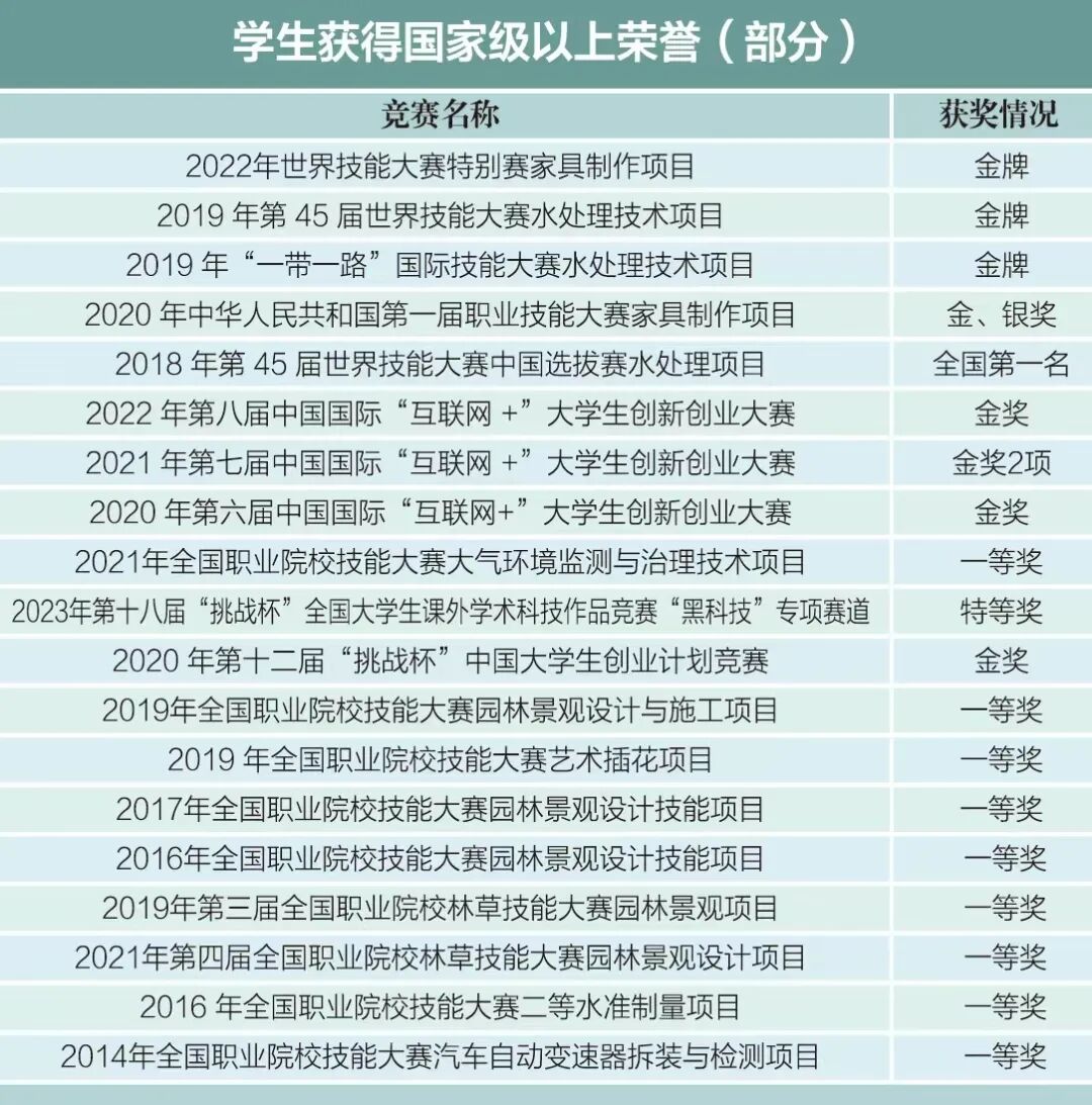 我院在2018-2022年全国普通高校大学生竞赛榜单(高职)位列第9。选手曾璐锋代表国家参加第45届世界技能大赛,勇夺水处理技术项目金牌,实现了江西省世赛金牌零的突破。选手李德鑫代表国家参加第2022年世界技能大赛,勇夺家具制作项目金牌,为中国夺得赛事首金。学院也成为全国唯一一所获得两枚世界技能大赛金牌的高职院校。