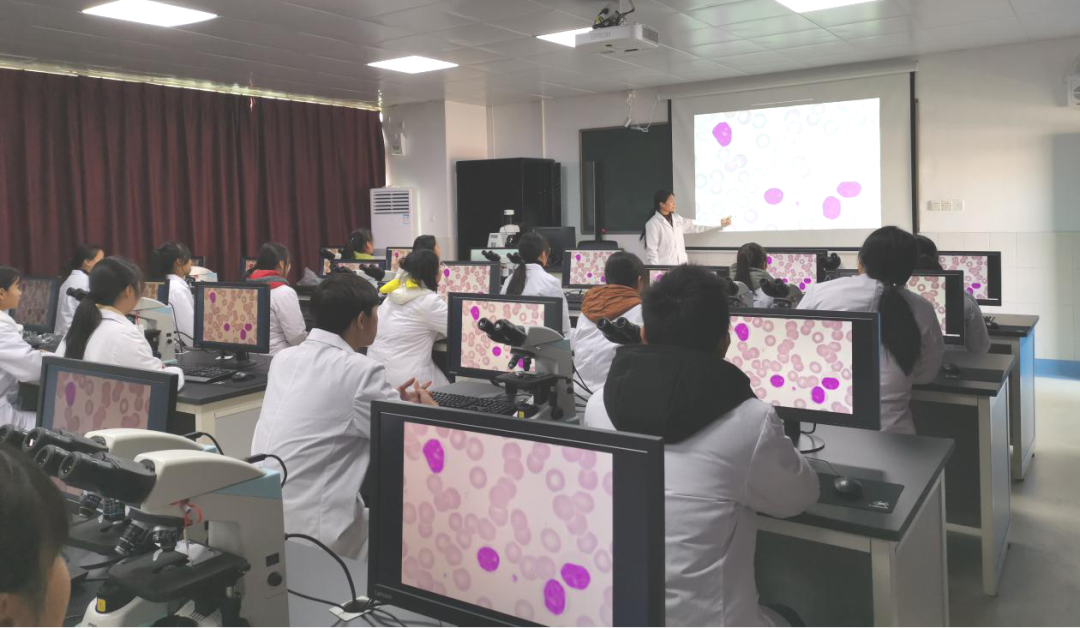 现有综合医学检验理实一体化实训中心1个,面积2000余㎡,仪器设备达600余万元。建有二级生物安全实验室1个、数码互动显微镜实验室1个、虚拟仿真实训室1个,各类理实一体化医学检验实训室8个、精密仪器室2个;另设有姚德欣劳模工作室和刘鹏博士科研工作站。主要实训设备有:全自动生化分析仪、五分类血细胞分析仪、尿沉渣分析仪、进口生物显微镜及数码摄像系统、切片扫描仪、荧光显微镜、生物安全柜、荧光实时定量PCR仪、凝胶成像系统、血凝仪、电子天平等。