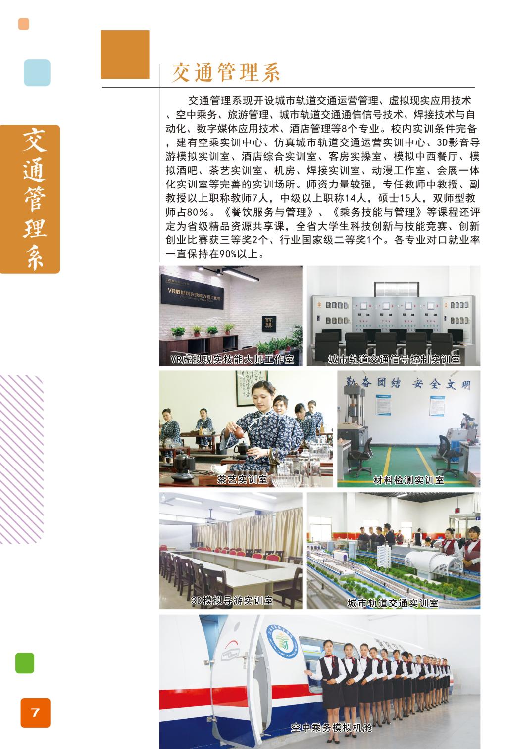 交通管理系现开设城市轨道交通运营管理、空中乘务、艺术设计、旅游管理、城市轨道交通通信信号技术、焊接技术与自动化、数字媒体技术等7个专业。校内实训条件完备,建有空乘实训中心、仿真城市轨道交通运营实训中心、3D影音导游模拟实训室、酒店综合实训室、客房实操室、模拟中西餐厅、模拟酒吧、茶艺实训室、机房、焊接实训室、动漫工作室、会展一体化实训室等完善的实训场所。师资力量较强,专任教师中教授、副教授以上职称教师7人,中级以上职称14人,硕士15人,双师型教师占80%。《餐饮服务与管理》、《乘务技能与管理》等课程还评定为省级精品资源共享课,全省大学生科技创新与技能竞赛、创新创业比赛获三等奖2个、行业国家级二等奖1个。各专业对口就业率一直保持在90%以上。