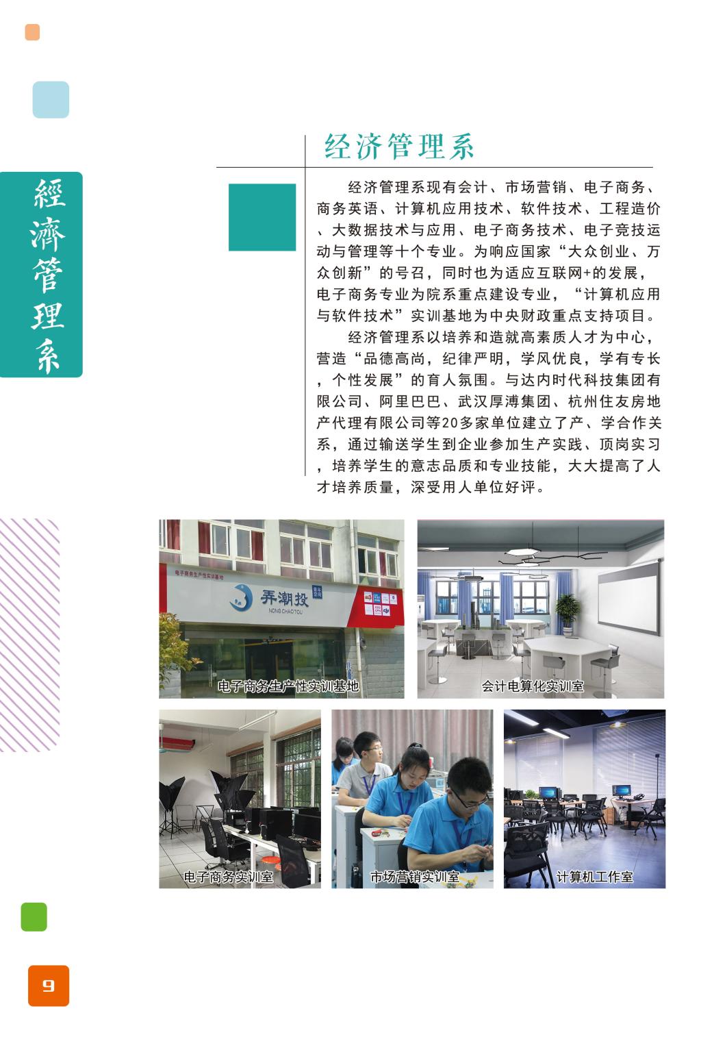 经济管理系现有会计、市场营销、电子商务、商务英语、计算机应用技术、软件技术、工程造价、大数据技术与应用、电子商务技术、电子竞技运动与管理等十个专业。为响应国家“大众创业、万众创新”的号召,同时也为适应互联网+的发展,电子商务专业为院系重点建设专业,“计算机应用与软件技术”实训基地为中央财政重点支持项目。