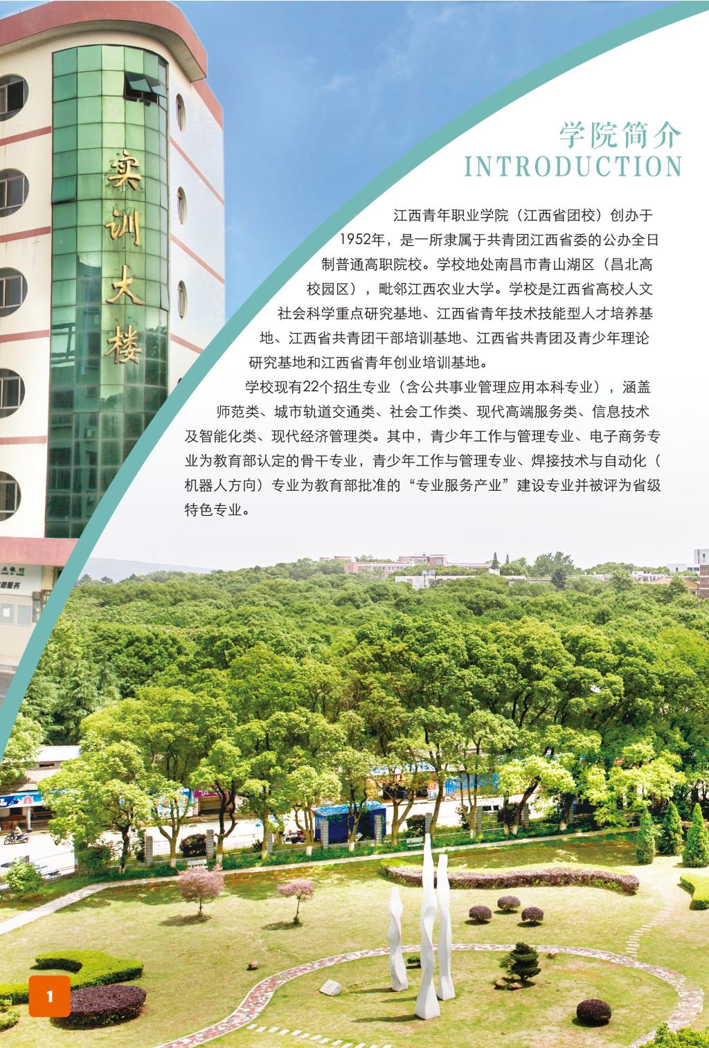 江西青年职业学院(江西省团校)创办于1952年,是一所隶属于共青团江西省委的公办全日制普通高职院校。学校地处南昌市青山湖区(昌北高校园区),毗邻江西农业大学。学校是江西省高校人文社会科学重点研究基地、江西省青年技术技能型人才培养基地、江西省共青团干部培训基地、江西省共青团及青少年理论研究基地和江西省青年创业培训基地。
