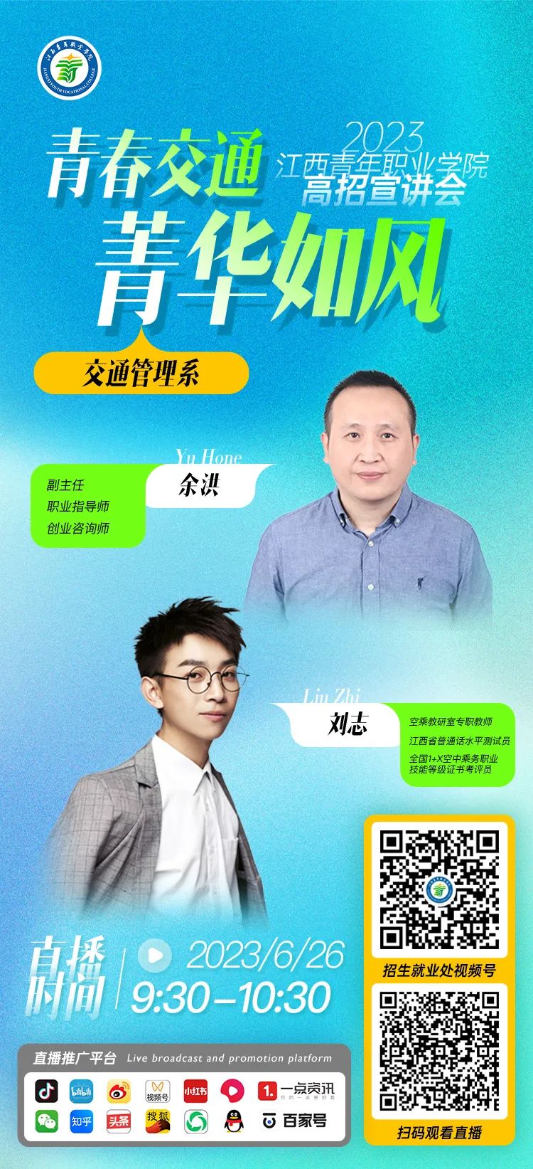 0 1 9:30-10:30 主讲嘉宾: 交通管理系副主任 余洪 空乘教研室专职教师刘志 宣讲主题: 青春交通,菁华如风