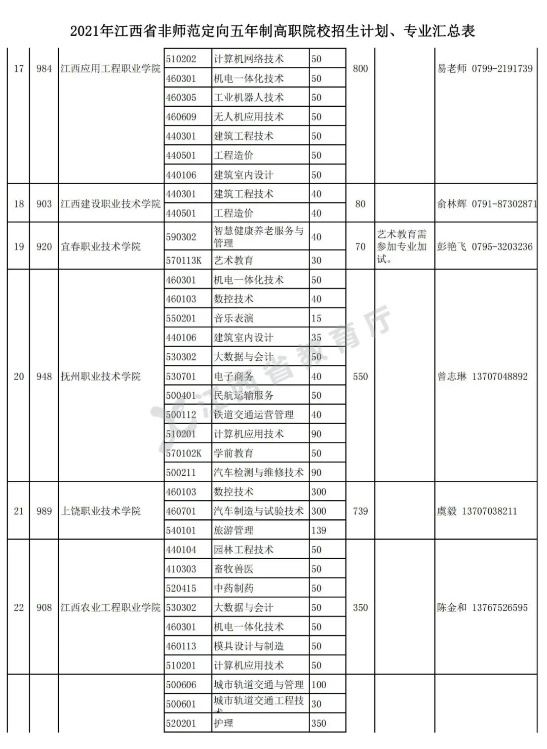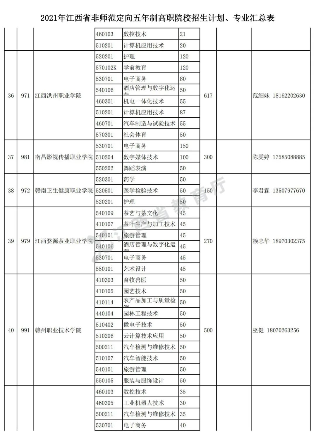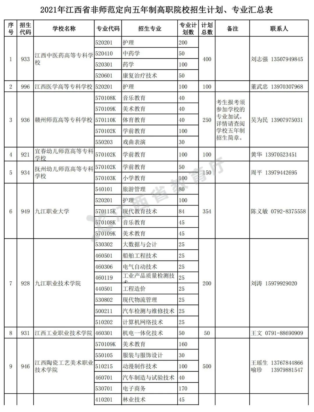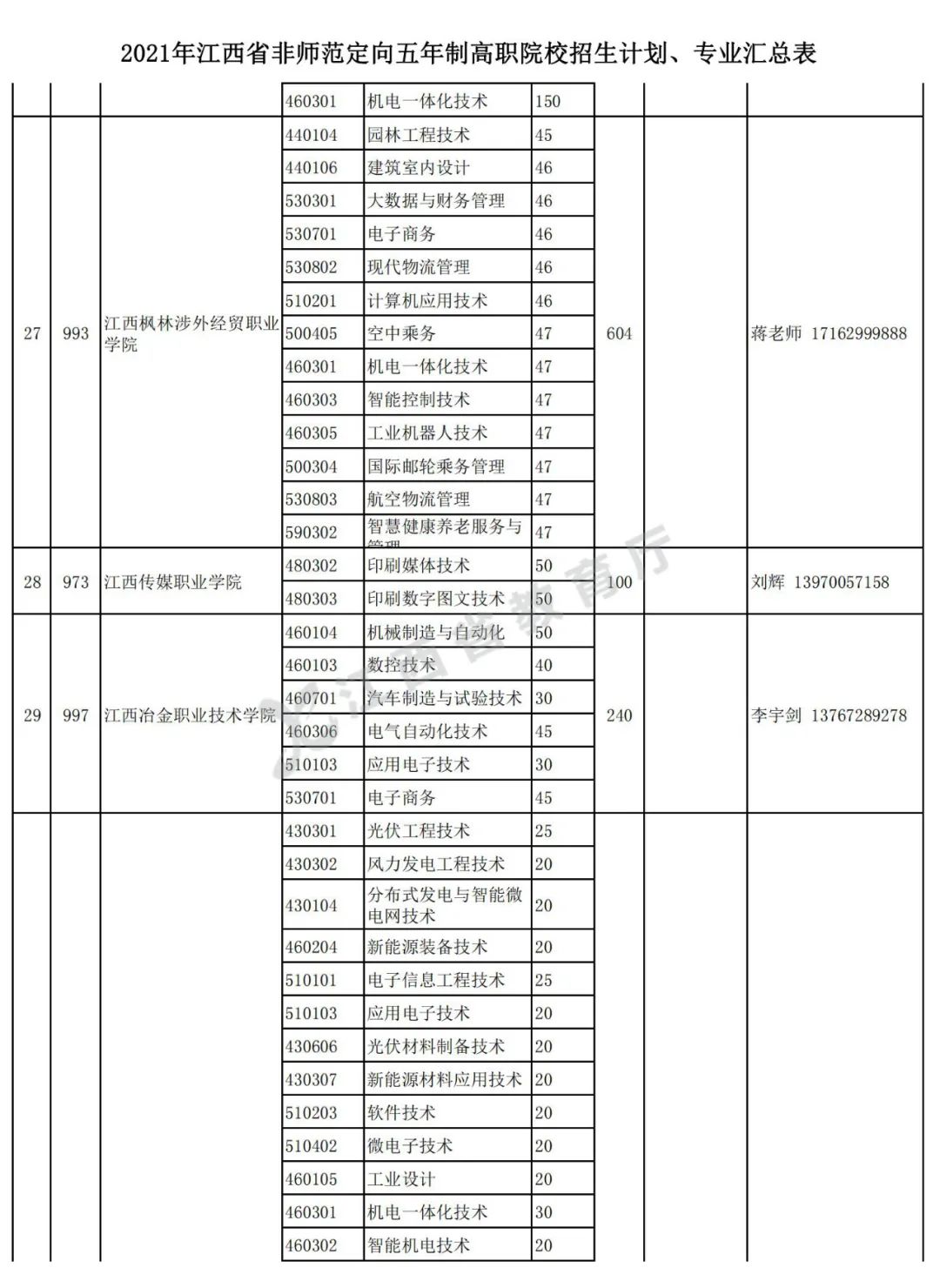 2021年江西省非师范定向五年制高职院校招生计划、专业汇总表