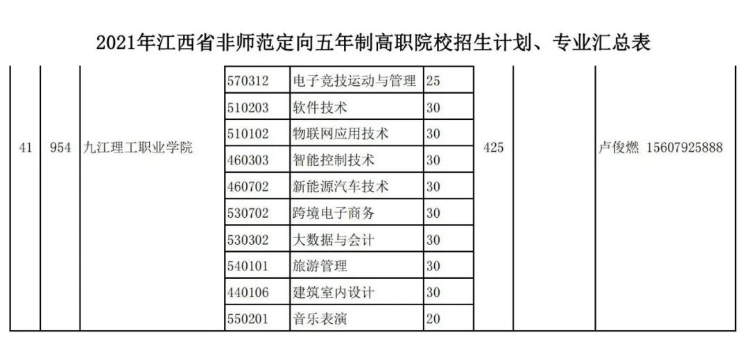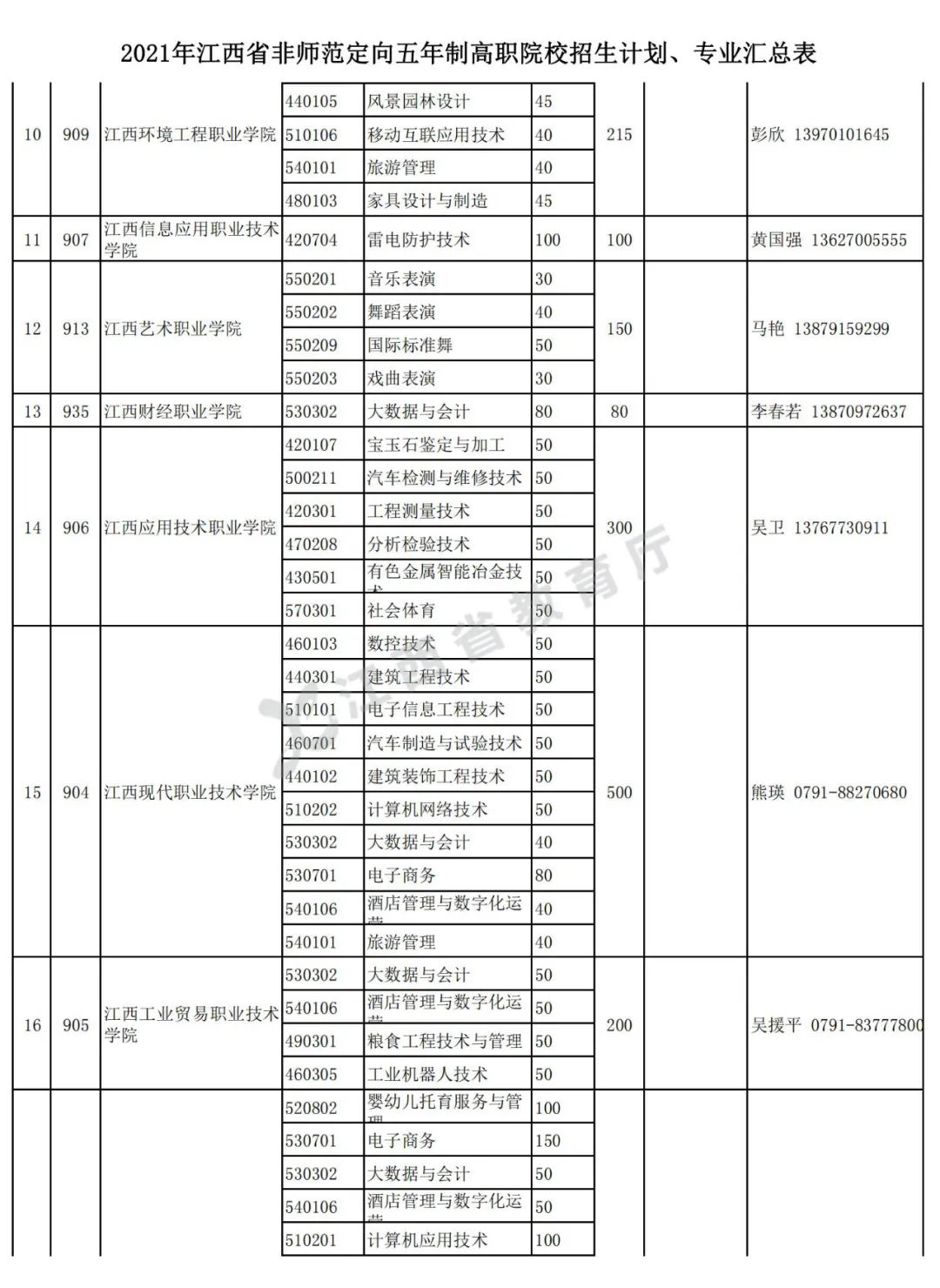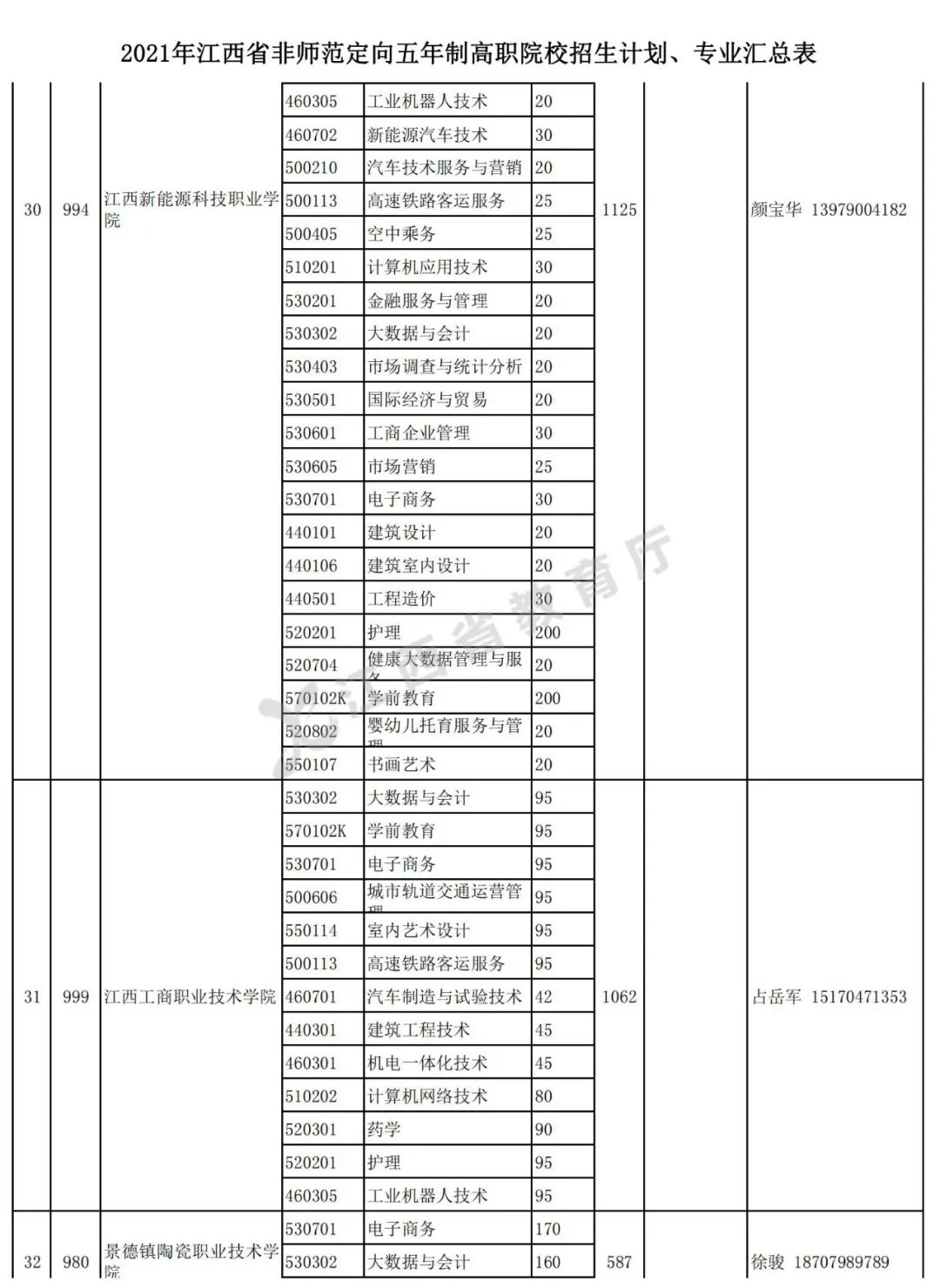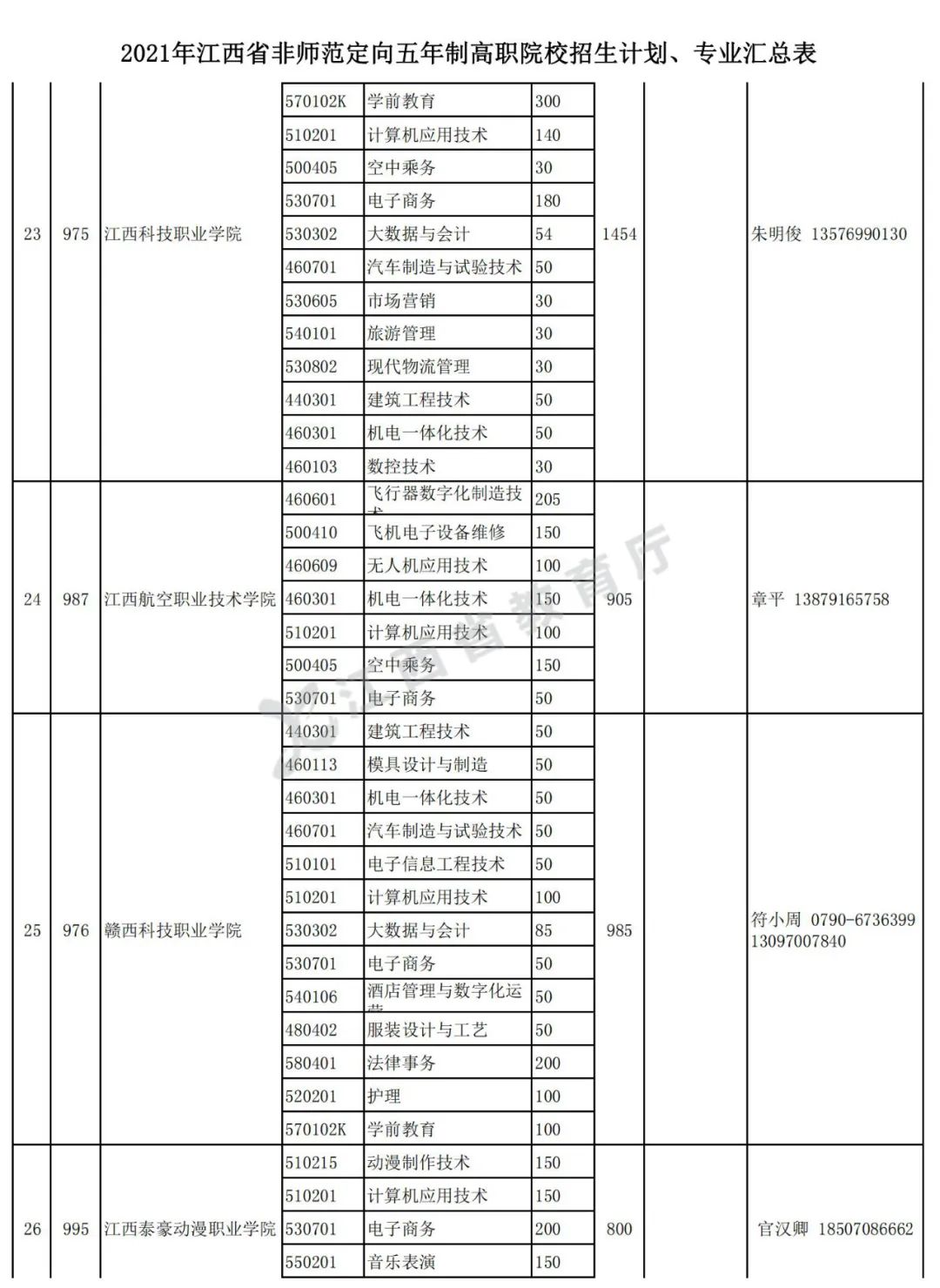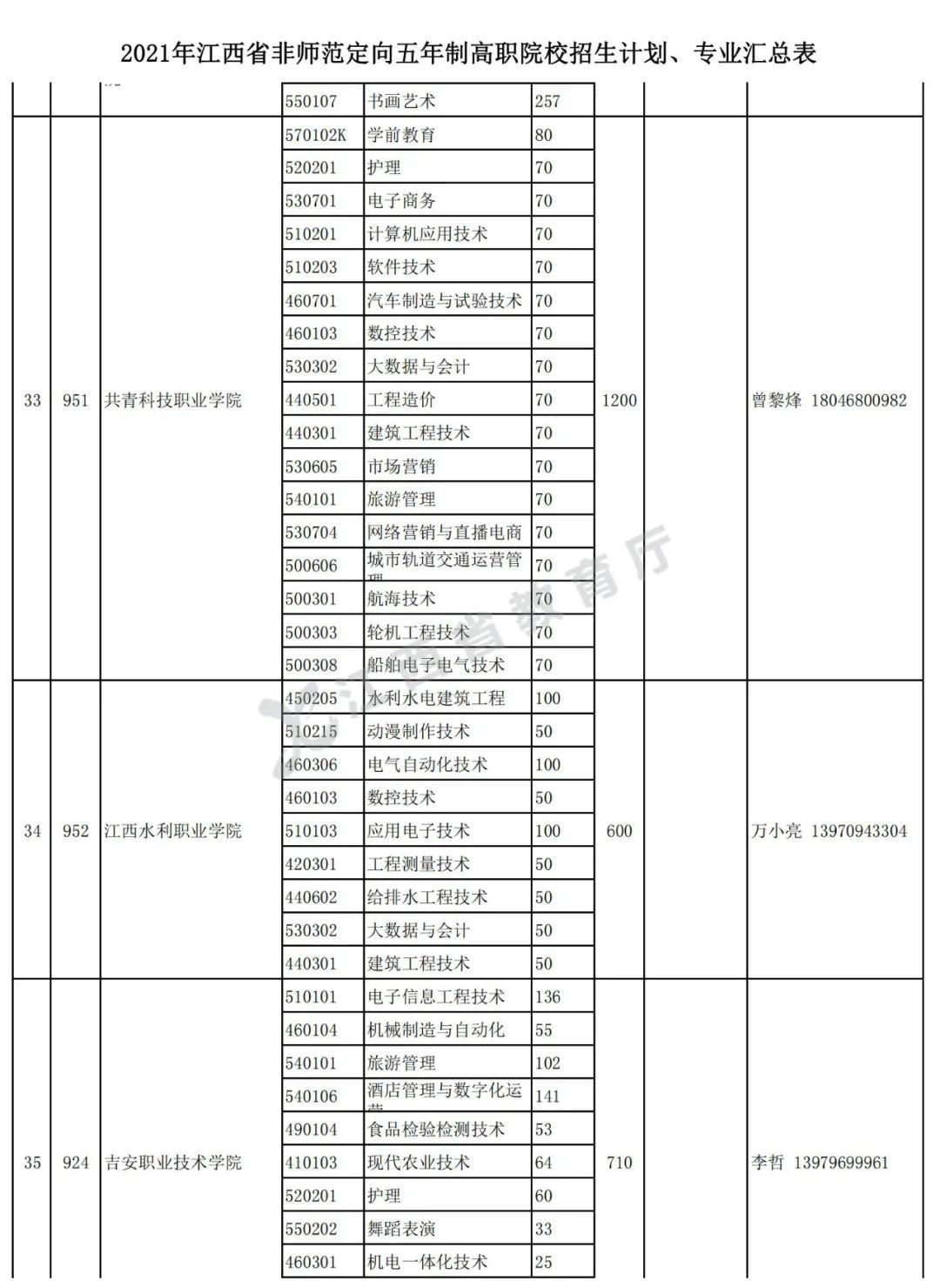 2021年江西省非师范定向五年制高职院校招生计划、专业汇总表