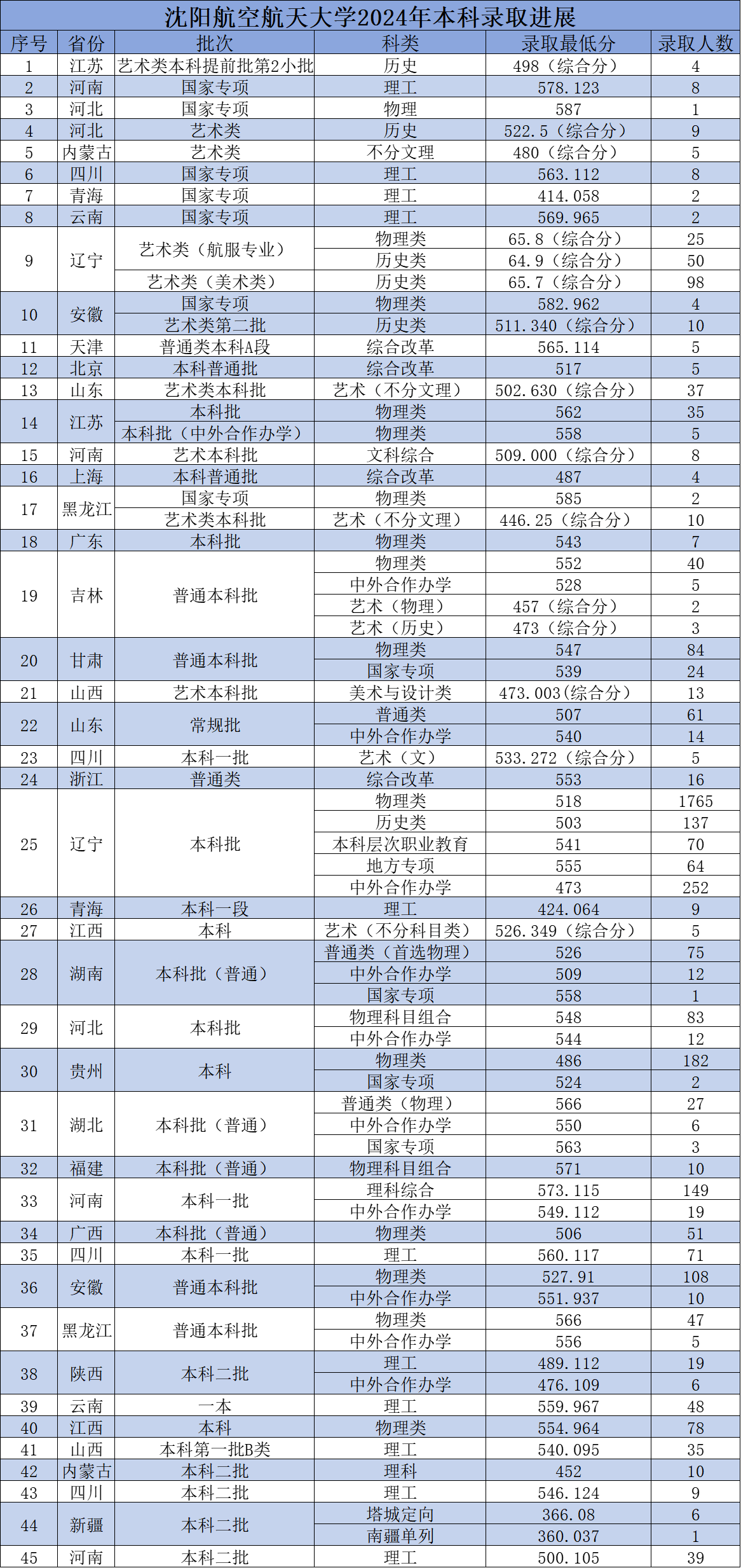 沈阳航空航天大学2024年高考录取部分批次已经结束,现将已录取结束的部分省份批次最低分及录取人数公布,该数据随录取工作的进展进行陆续更新,敬请各位考生及家长关注!