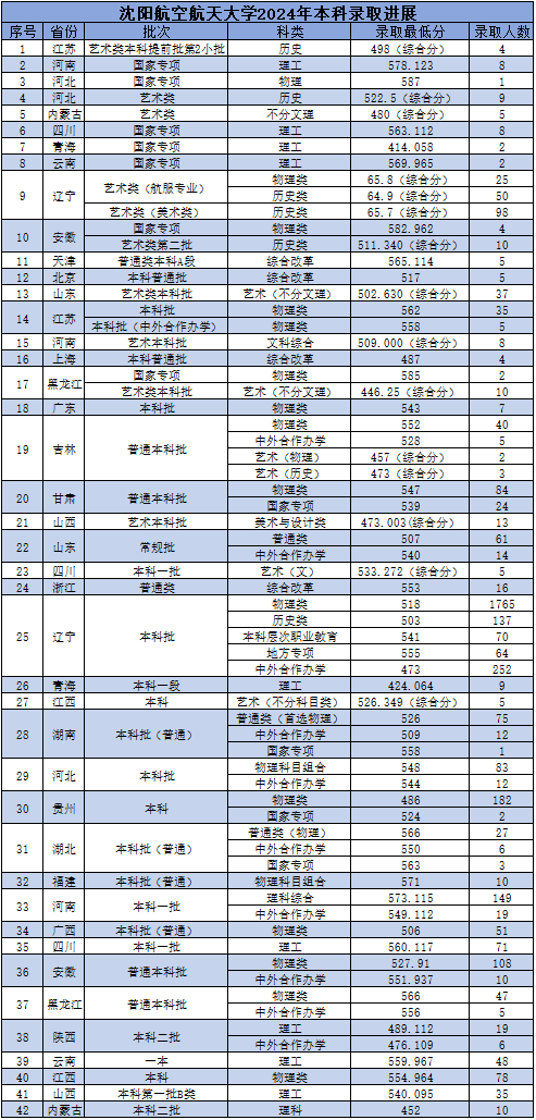 沈阳航空航天大学2024年高考录取部分批次已经结束,现将已录取结束的部分省份批次最低分及录取人数公布,该数据随录取工作的进展进行陆续更新,敬请各位考生及家长关注!