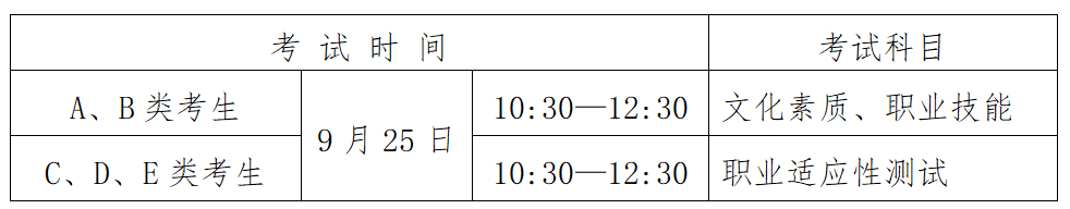 “A、B类考生”:按照“文化素质+职业技能”考试方式。文化素质考试科目:语文(150分)、数学(150分);职业技能:职业适应性测试(100分)。