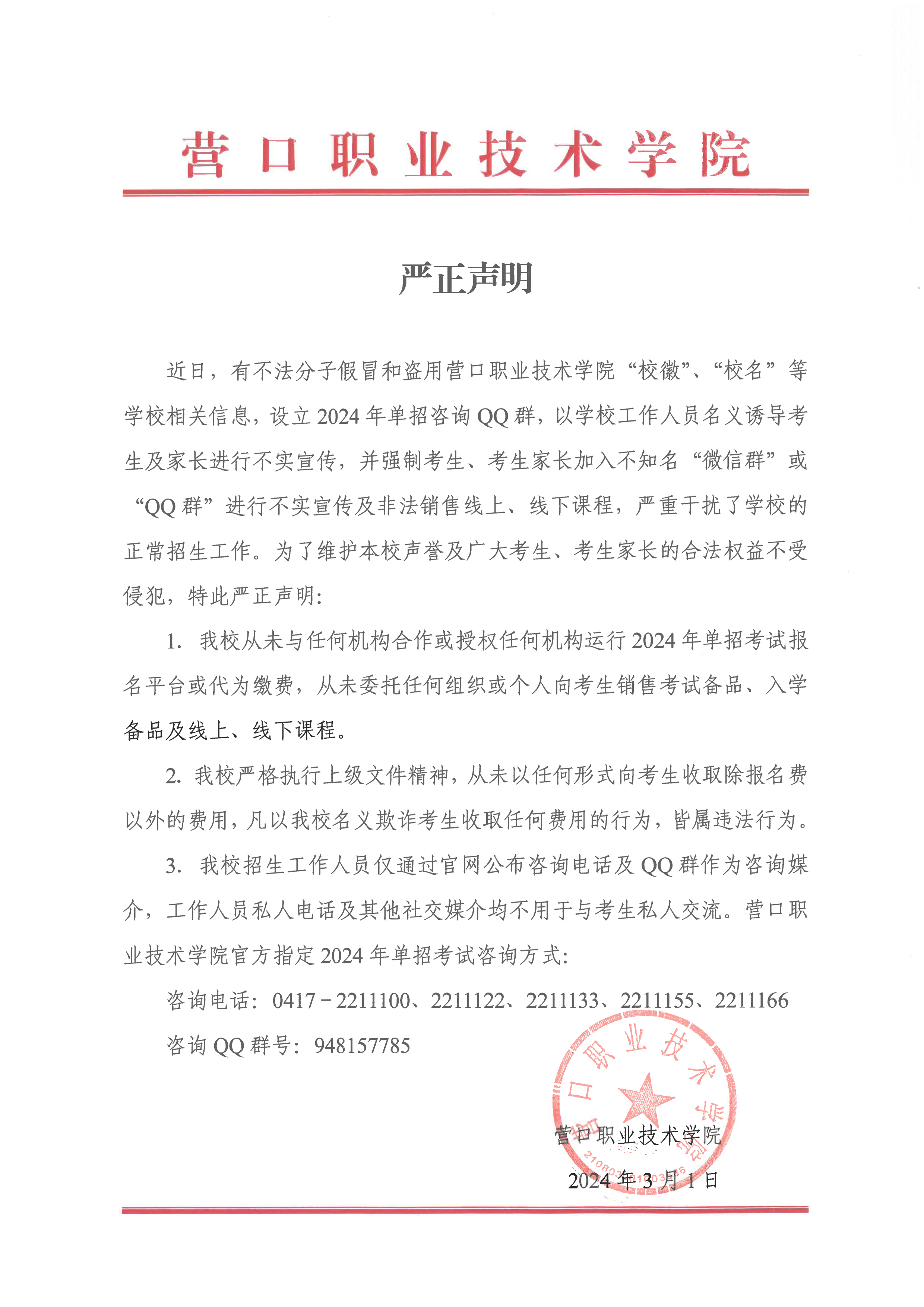 二、我校从未在任何地区授权任何社会机构和个人以“营口职业技术学院”的名义进行招生;亦从未委托任何社会机构或个人为我校进行有偿招生或代收任何其它费用。任何自称与我校合作承诺包录取的宣传及乱收费的行为,均属违法行为,与营口职业技术学院无关。