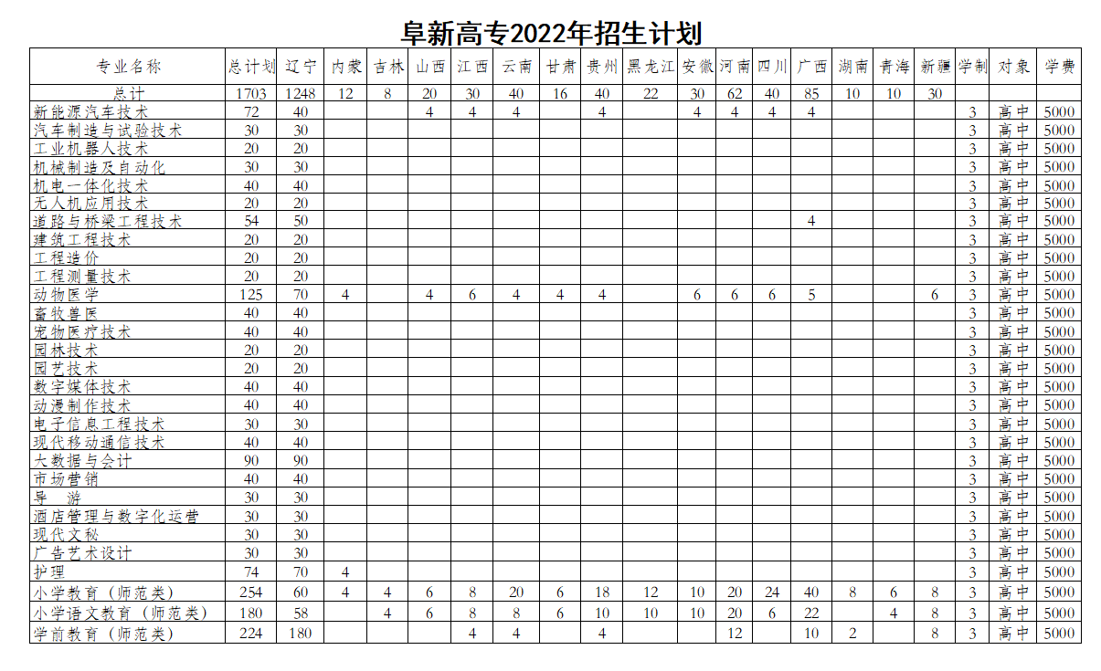 阜新高等专科学校2022年高中、三校生起点专科招生计划