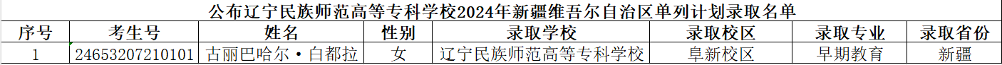 公布辽宁民族师范高等专科学校2024年新疆维吾尔自治区单列计划录取名单