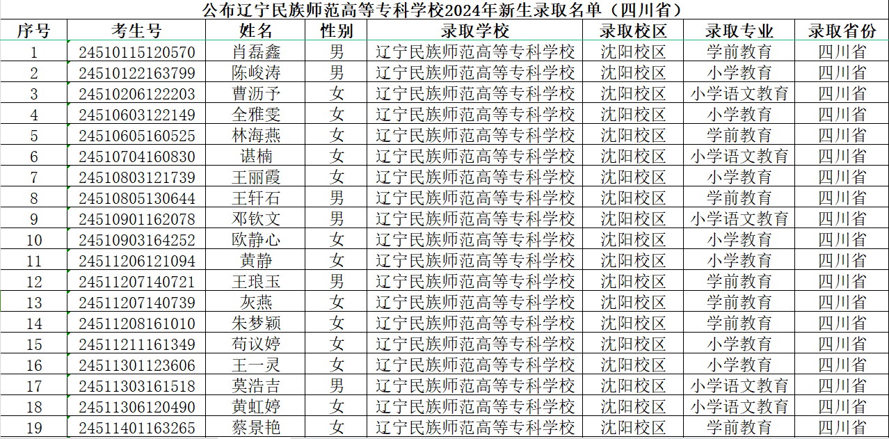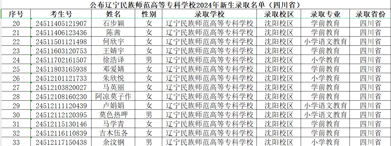 辽宁民族师范高等专科学校2024年新生录取名单(四川省)