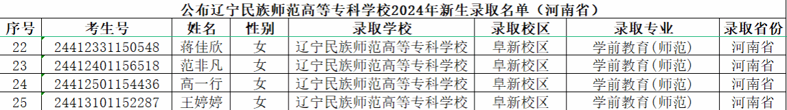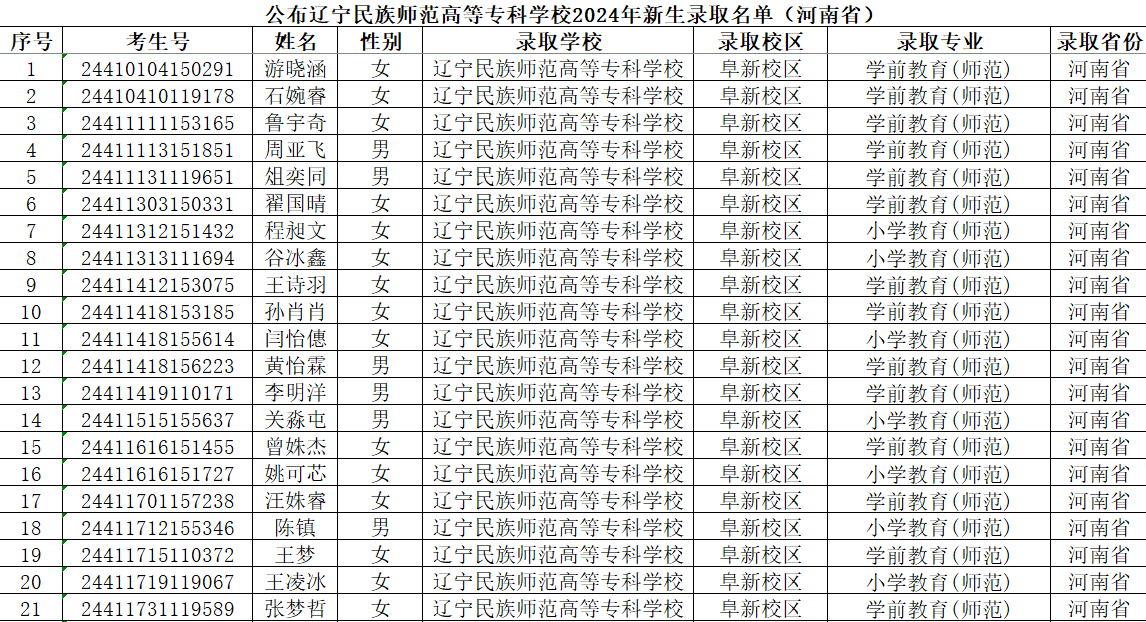 辽宁民族师范高等专科学校2024年新生录取名单(河南省)