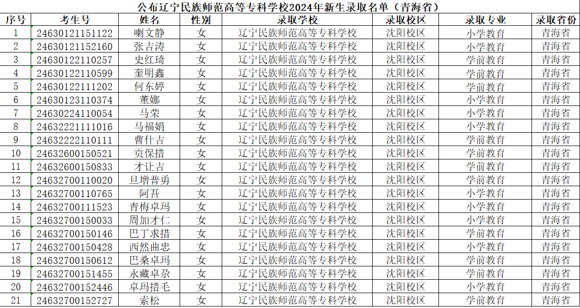辽宁民族师范高等专科学校2024年新生录取名单(青海省)