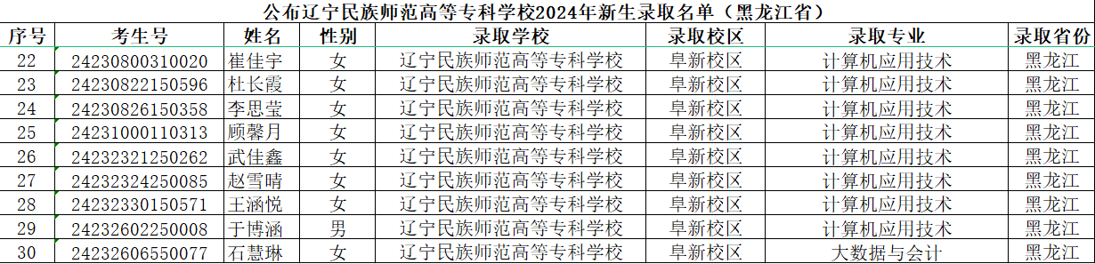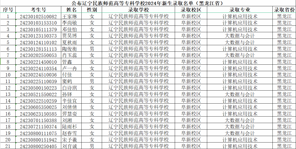辽宁民族师范高等专科学校2024年新生录取名单(黑龙江省)