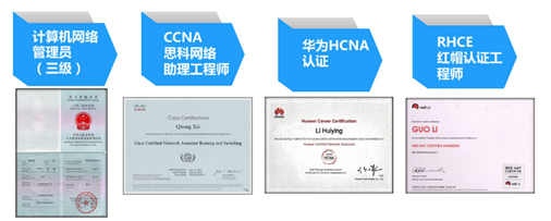 锐捷认证网络工程师系列(RCNA、RCNP)、思科认证网络工程师系列(CCNA、CCNP)、华为认证网络工程师系列(HCDA、HCDP、HCIE)、红帽认证网络工程师系列(RHCE/RHCA)、全国软件水平/资格证书(网络管理员、网络工程师)。