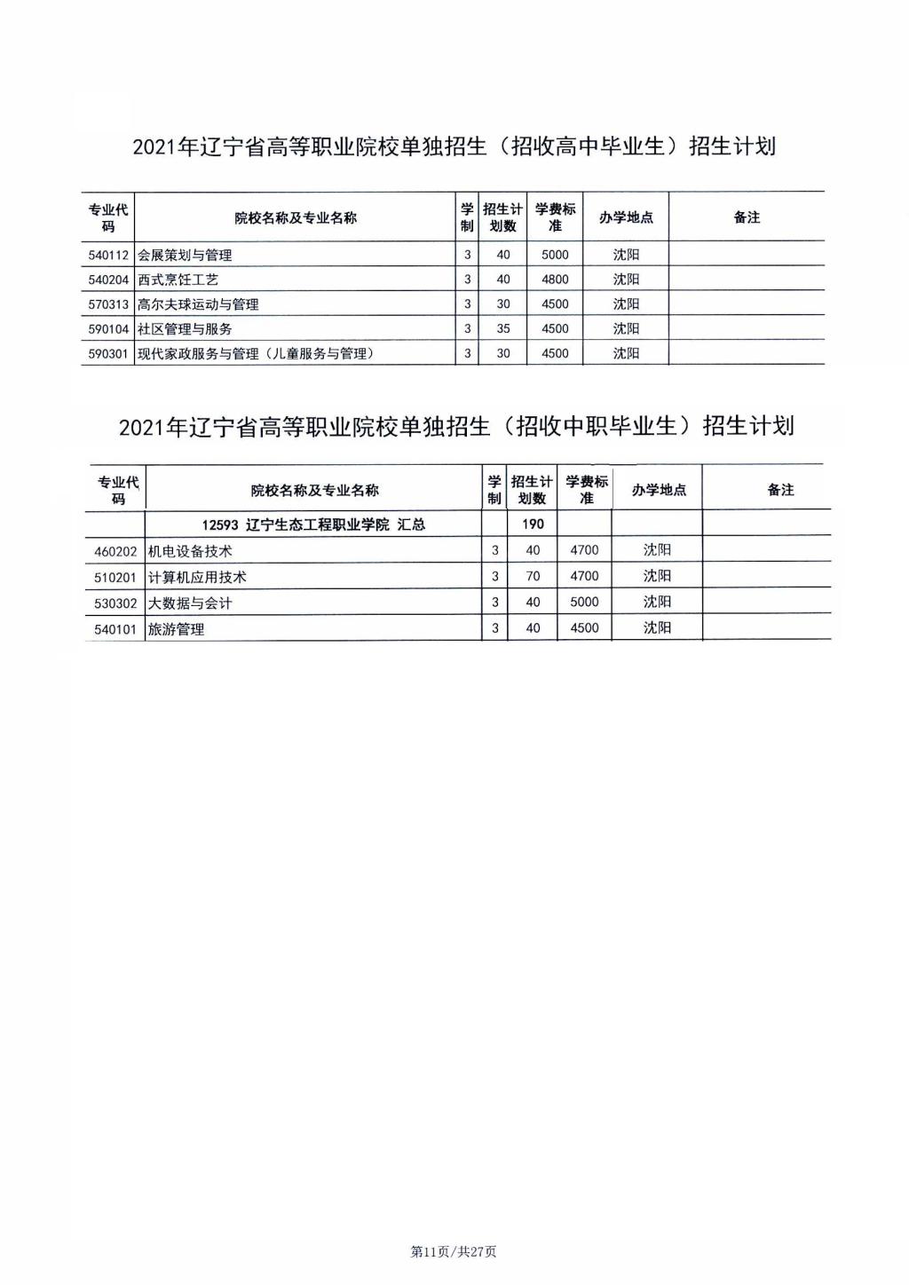辽宁生态工程职业学院2021年单独招生第一阶段招生计划
