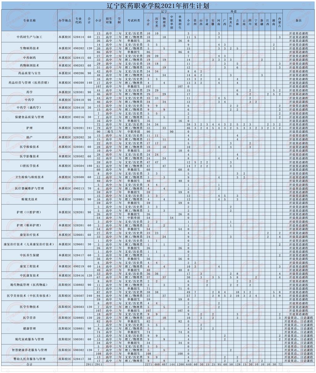 辽宁医药职业学院2021年招生计划