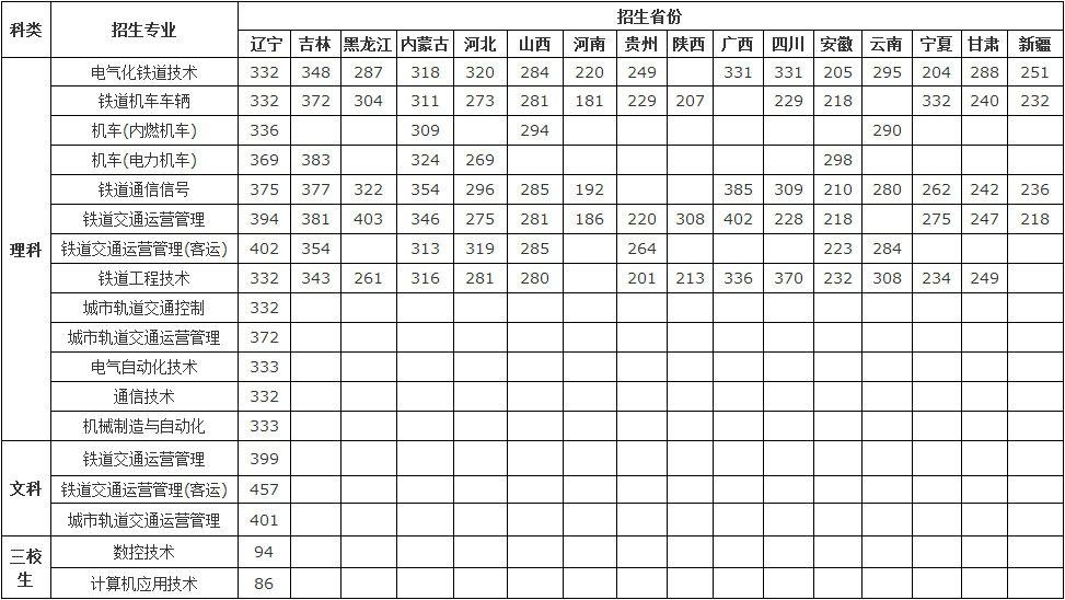 辽宁铁道职业技术学院2012年各省录取分数线