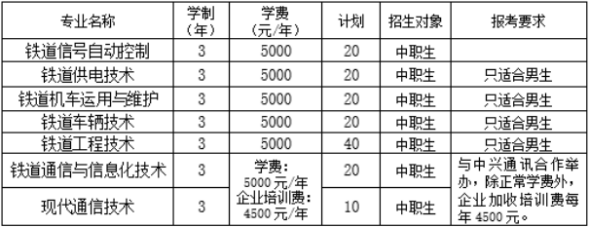 3.各招生专业收取学费标准均为:5000(元/年/生)。铁道通信与信息化技术、现代通信技术专业由我校与中兴通讯股份有限公司合作举办,除学费5000(元/年/生)外,企业加收培训费4500(元/年/生)。学生因故退学或提前结束学业的,学校根据学生实际学习时间,按月计退剩余的学费和住宿费。