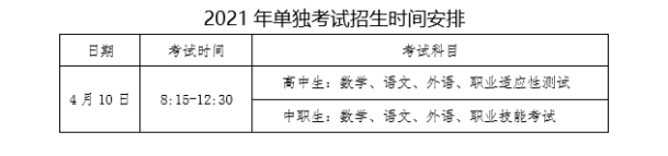 考试科目:数学(满分150分)、语文(满分150分)、英语(满分100分)、职业技能考试(满分100分),总分500分。