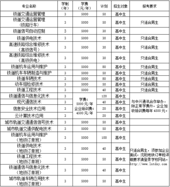 说明:1.考生最多可填报六个专业志愿。2.报考与中兴通讯合作办学的铁道通信与信息化技术、现代通信技术、信息安全技术应用、云计算技术应用四个专业的考生,不能报考其他专业。3.各招生专业收取学费标准均为:5000(元/年/生)。铁道通信与信息化技术、现代通信技术、信息安全技术应用、云计算技术应用由我校与中兴通讯股份有限公司合作举办,除学费5000(元/年/生)外,企业加收培训费4500(元/年/生)。学生因故退学或提前结束学业的,学校根据学生实际学习时间,按月计退剩余的学费和住宿费。4.沈阳地铁订单班招生详细要求请登录学校网站(http://www.lntdxy.com)了解。 5.计划在高中毕业生中招收体育特长生15人,招生项目及计划分别为:足球4人(男生)、篮球4人(男生)、排球2人、田径5人。
