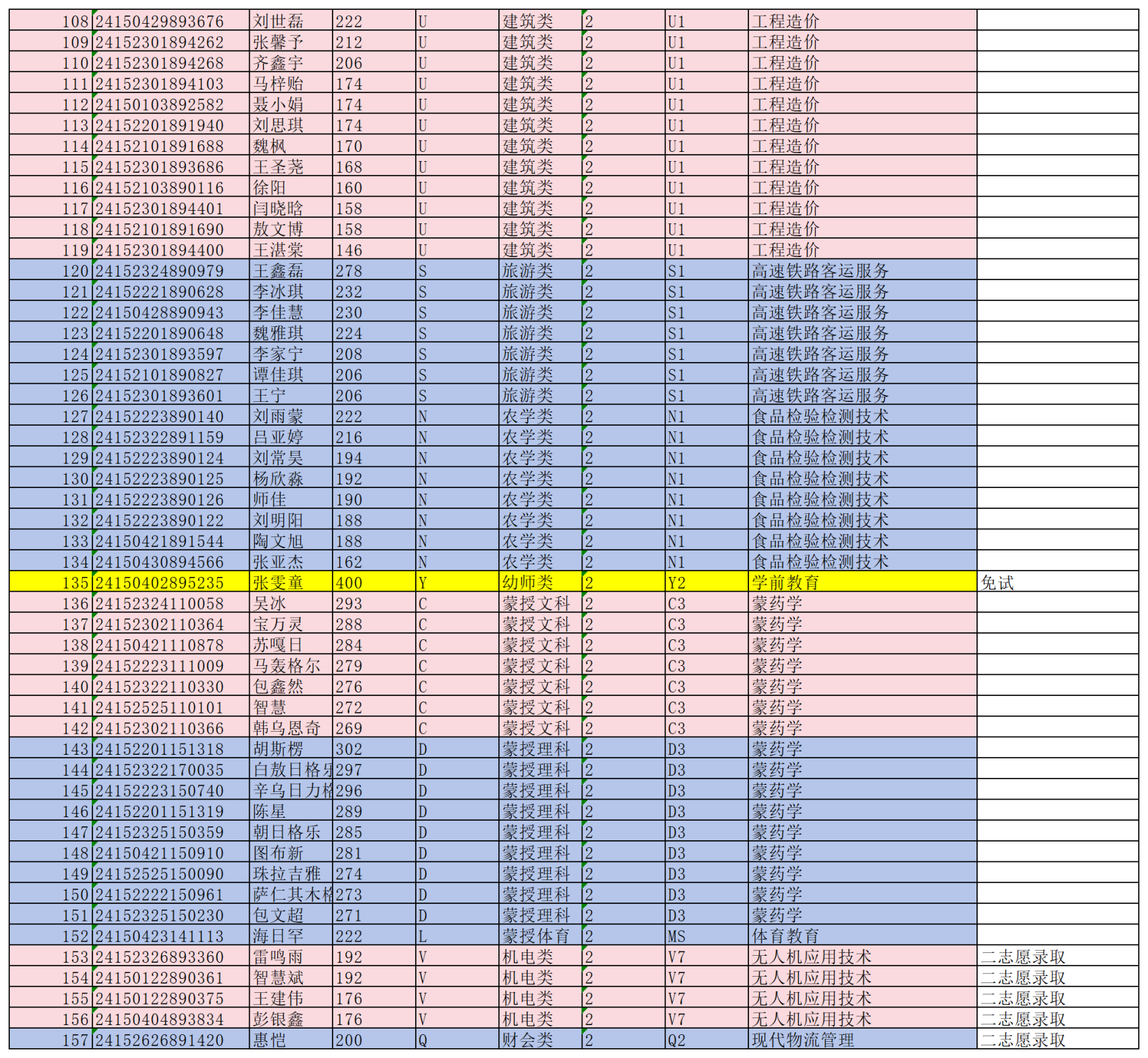 1.按照公开、公平、公正的原则,采取“专业志愿清”录取规则。当考生成绩相同时,文科和蒙授文科考生依次按语文、数学、文科综合、外语,理科和蒙授理科考生依次按理科综合、数学、语文、外语,中职对口升学考生依次按专业综合、数学、语文、外语等成绩高者优先录取。