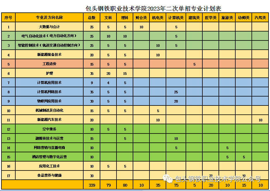报名流程 第一步 志愿填报时间 报名时间:2023年4月7日—9日 报名网站: https://www.nm.zsks.cn,登录内蒙古招生考试信息网。 第二步 登录考生号和密码志愿填报 考生只能填报1所院校志愿和3个专业志愿(录取原则以第一志愿,按照院校招生计划择优录取),同时要选择是否服从普通专业和高收费专业调剂。高收费专业是指学费标准高于1万元的专业。 考试 考试时间:2023年4月12日(星期三) 考试形式:线上网络远程 考试科目:普文、普理考生考试科目为语文、数学、英语、思政综合卷;对口中职考生考试科目为语文、数学、英语、思政+各科类综合卷。 考试范围:普通高中基础知识、职业高中基础知识+技能。 考核包括:笔试、面试两部分,考生不享受其他政策加分。 (1)笔试(满分200):考生根据自己所报专业答题。 (2)面试(满分100):考察考生的举止仪表、语言表达能力、应变能力等。 免试录取:中等职业学校毕业生,获得全国或全区职业院校技能大赛三等奖及以上奖项。报考我院,审核合格后免试录取。 考试准备:考生需要准备一台电脑和一部智能手机,以微信群+腾讯视频会议模式参加考试(具体要求和流程,详见学院官网http://www.btsvc.edu.cn,考前发布)。 系部简介 财会金融系 开设大数据与会计、大数据与审计、金融服务与管理3个专业,建有财务共享实训中心、会计信息化实训室、企业经营沙盘模拟实训室等,连续两年 1+X证书考试通过率均100%。建有北京和包头两个校外实习基地,先后与北京中企盈飞、内蒙古鑫财税等多家企业建立校企合作关系,实现毕业与就业无缝对接。 建筑工程系 开设工程造价、建筑消防技术、建筑装饰工程技术、建设工程管理等专业。建有各类专业软件机房、实训室等8个校内实践教学基地,与中国二冶、内蒙古广厦、包头中科智慧应急研究所、包头博瑞消防、内蒙古鸿奇建筑装饰等20多家企业签订校企合作协议,就业率高。 护理与健康管理系 前身为包钢医院卫生学校,2017年纳入包头钢铁职业技术学院,开设护理专业。该系注重护理专业教学研究的发展机制,现与内蒙古包钢医院、包钢第三医院签订校企合作协议,并与包头医学院结对共建。综合了包头市地区先进的教学、医疗机构为学院护理专业的发展奠定了坚实的基础。 冶金化工系 内蒙古自治区唯一开设冶金、稀土专业的高职院系。专业包括:钢铁智能冶金技术、钢铁冶金设备维护、稀土新材料技术、应用化工技术、食品营养与健康。与包钢、沙钢等优质企业建立稳定的校企合作关系。“冶金、稀土绿色智能制造虚拟仿真实训基地”入选首批自治区级职业教育示范性虚拟仿真实训基地名单。 机械工程系 学院创建历史最长,规模最大的院系之一。自治区品牌专业“机电一体化技术”自2005年开始招生,连续招生17年,形成了成熟的“工学结合”人才培养模式,“信息化”教学方法,技术先进的校内实训基地和实力雄厚的校外实训基地,为包钢集团、京东方集团等知名企业输送了大量的技能人才。 经济管理系 开设酒店管理与数字化运营、空中乘务、高速铁路客运服务等专业。建有酒店实训室、形体训练室、航空模拟舱和安检实训室等,与包钢宾馆、北京翔宇航空集团、包头海德酒店、鄂尔多斯博源豪生大酒店等企业建立稳定的校企合作关系,就业率高、社会评价好。 计算机信息管理系 设有计算机应用技术、计算机网络技术、物联网应用技术3个专业。建有专业软件仿真实训室、物联网技术实验室、网络实训室、网络综合布线实训室等校内实训基地。毕业生就业率达到98%以上,广泛就职于北京、上海、深圳等城市IT行业及相关技术行业,得到了社会和企业的广泛赞誉。 数控工程系 开设机械制造及自动化、智能制造装备技术、新能源汽车技术、汽车制造与试验技术四个专业和3D打印技术、智能工业设计两个方向。多年来着重打造智能制造方向类专业,全面提高学生操作实践技能。拥有自治区级精品课程和高校优秀教学团队,实现学生大企业名企业就业。 电气工程系 设有电气自动化技术(自治区品牌专业)、机电一体化技术、智能控制技术等5个专业。实习、实训条件较完善,建有7个校内实训室,9家稳固的校外实习基地。突出素质教育与创新能力的培养;学生在各级各类职业技能大赛中均取得优异成绩,参加技能鉴定职业资格证书考试,通过率达90%以上。 考生答疑 1.毕业是否可以专升本? 答:在校期间没受过纪律处分或者报名前处分撤销的同学,都可以参加自治区教育厅统一组织的专升本报名考试,选择报考区内本科院校。 2.入学是否可以转专业? 答:新生入学报到,军训和入学教育结束后,正式上课前,学院给申请转专业的同学集体统一办理,所有开设专业均可办理转专业。 3.考试是否收费? 答:学院单招考试不收取任何费用,考生无需缴费。 联系方式 内蒙古自治区包头市昆区阿尔丁大街76号包头钢铁职业技术学院招生就业处 联系电话:0472-2897223 网址: http://www.btsvc.edu.cn