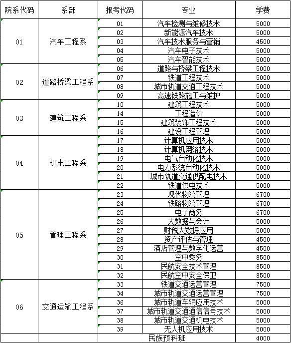 学院确立“大交通”“新交通” 专业建设理念,打造新能源汽车、道路桥梁工程技术、高速铁路工程技术、建筑工程技术、铁道交通运营管理、城市轨道交通运营管理、无人机应用、空中乘务、民航安全技术管理、物流管理、电子商务、大数据应用、电力系统自动化技术等 35 个专业。其中铁路类与神舟高铁、各大铁路局合作;民航类与首都机场等各大航空公司合作;物流、电子商务类与京东合作;道路桥梁类与中铁各局合作;汽车类与一汽集团等各大汽车集团合作,入校即就业。学院专升本渠道通畅,每年有15%--20% 的学生考入本科院校。