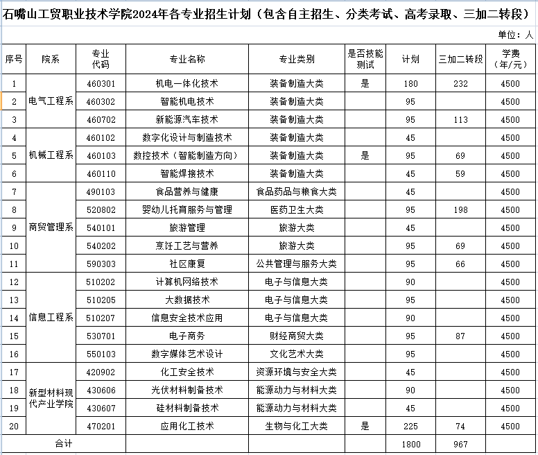 石嘴山工贸职业技术学院2024年各专业招生计划(包含自主招生、分类开始、高考录取、三加二转段)