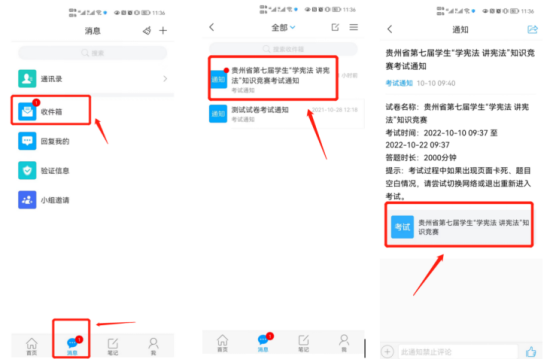 3.进入考试:登录成功之后,在收件箱里找到考试发布的考试通知,进入考试。