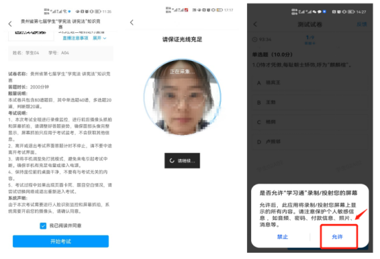 4.进入考试之后会提示“学习通录制\投射您的屏幕上显示的所有内容”,考生需点击“允许”。(考生必须主动授权视频和音频权限,否则将会影响考试)。