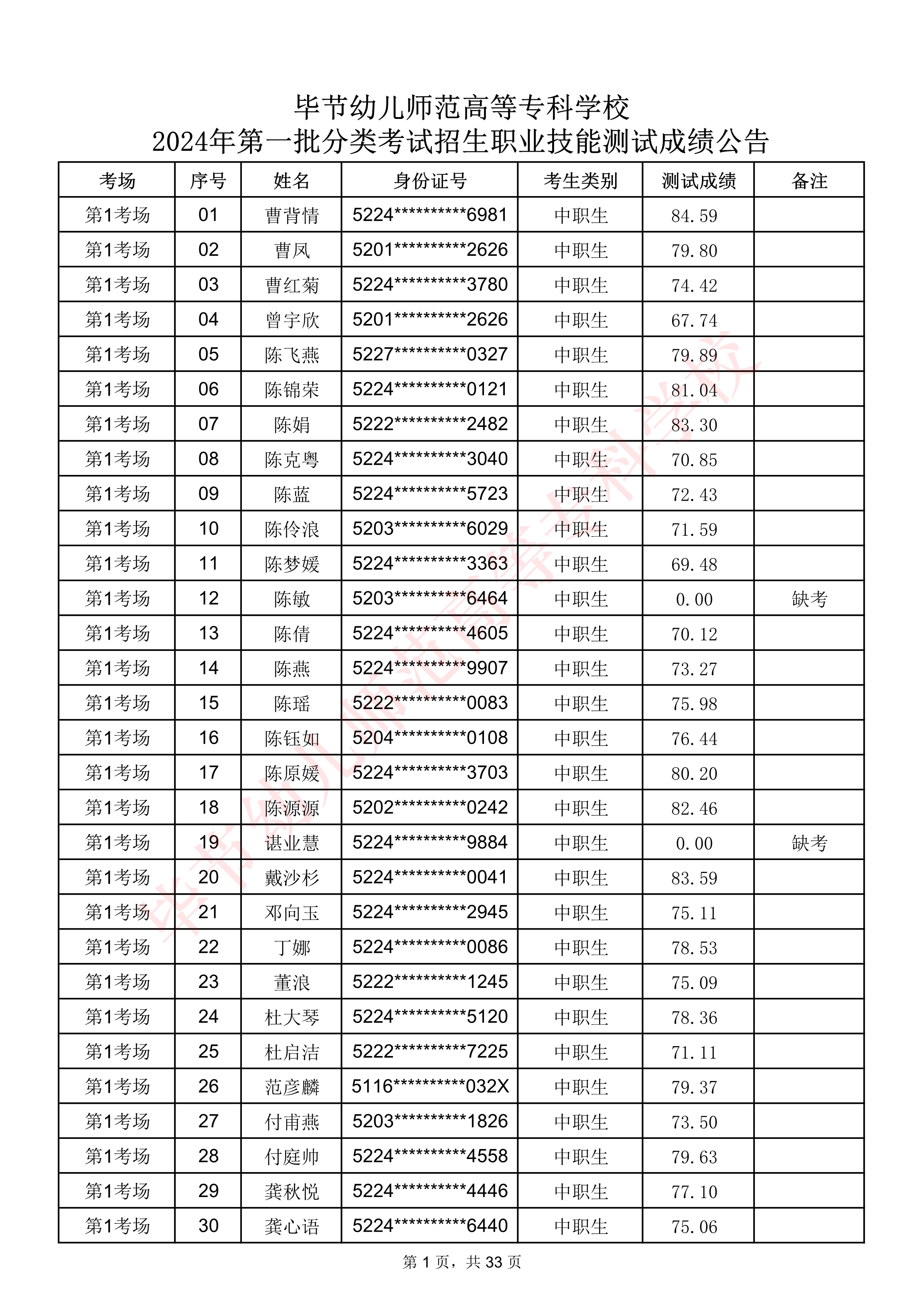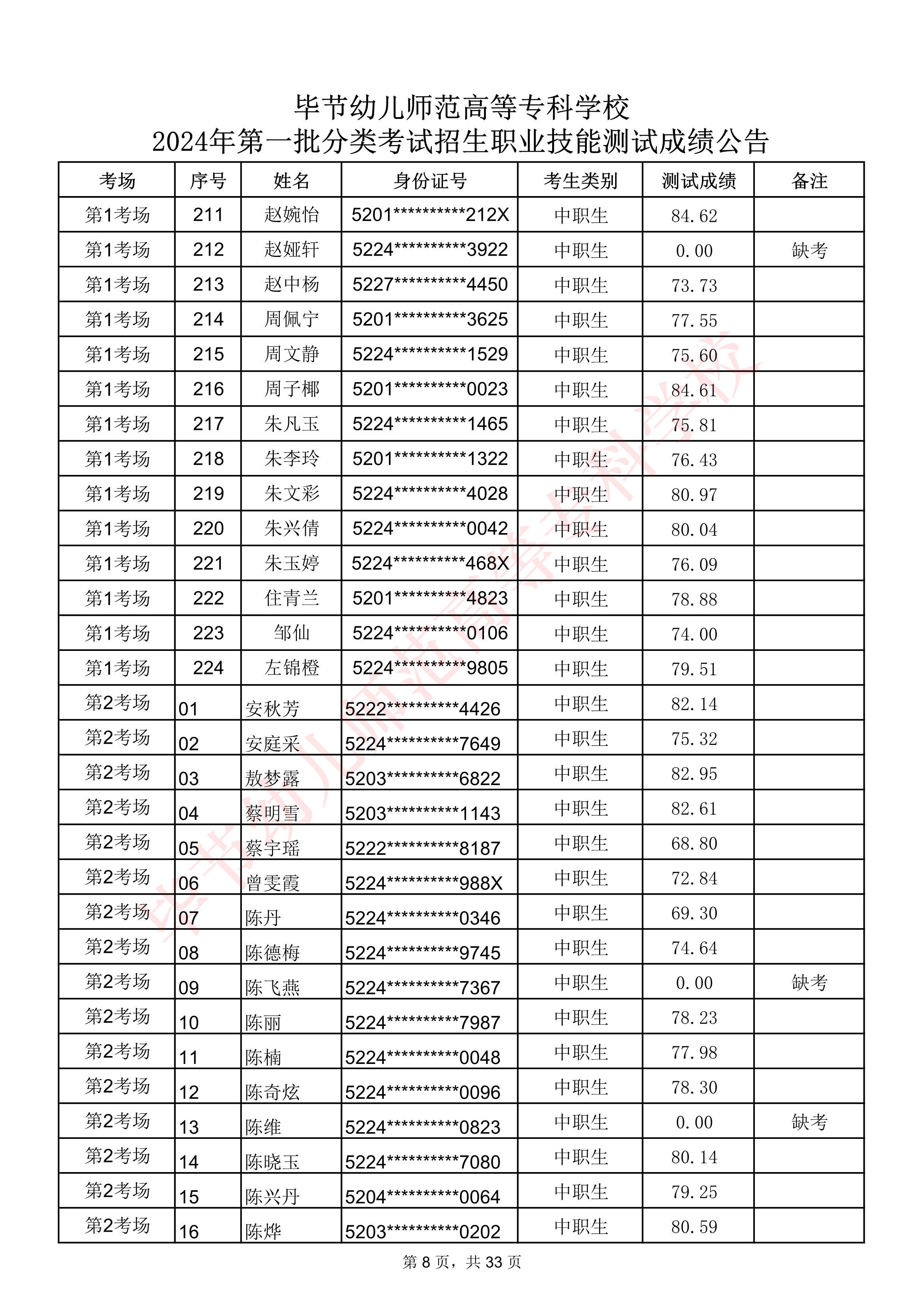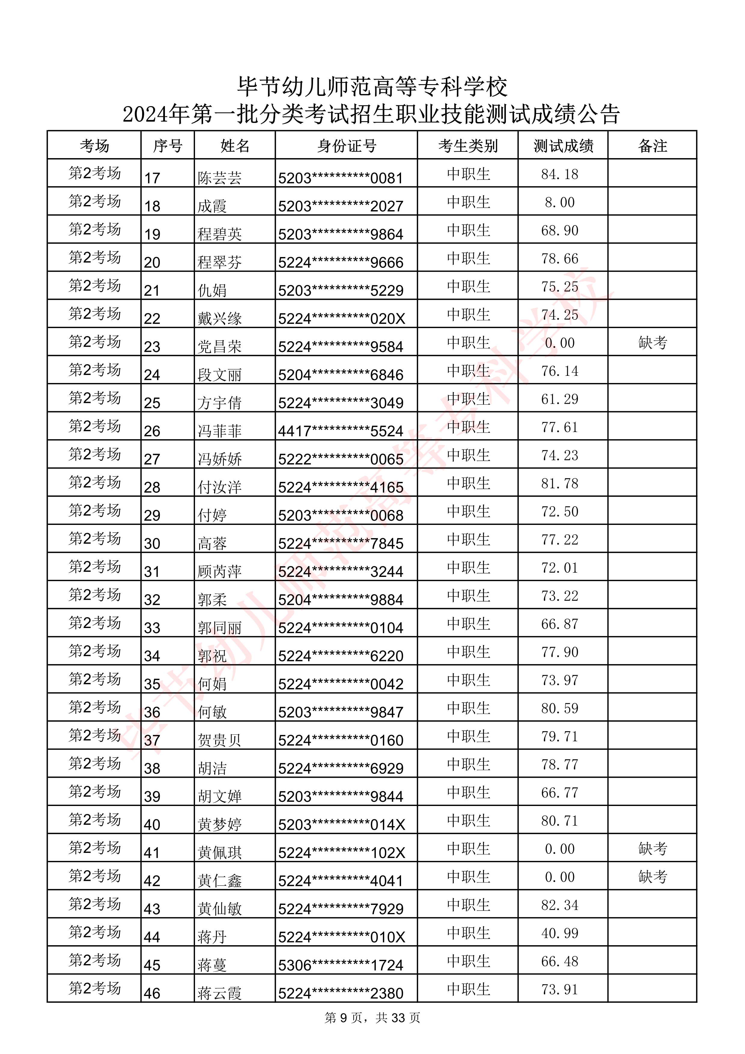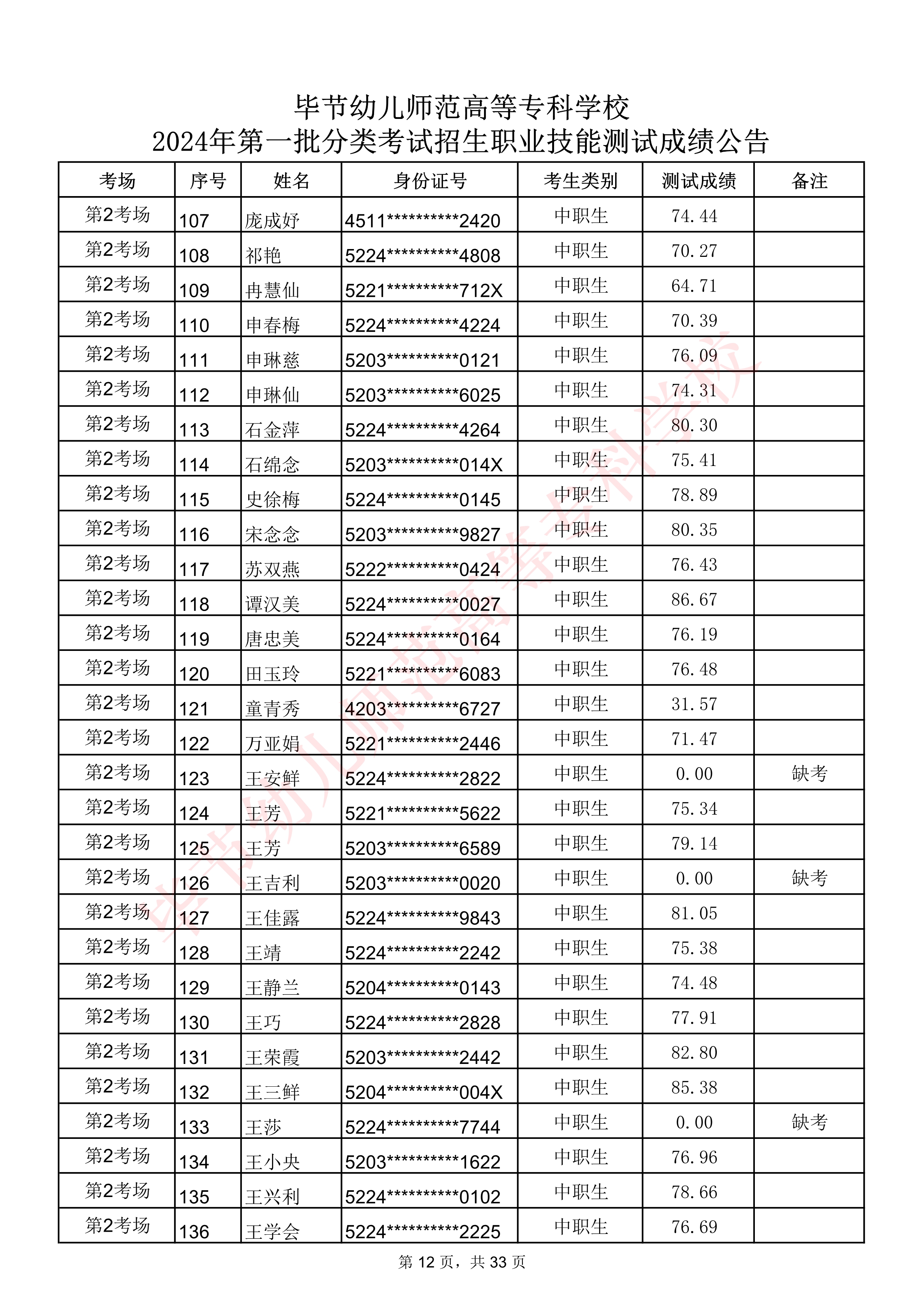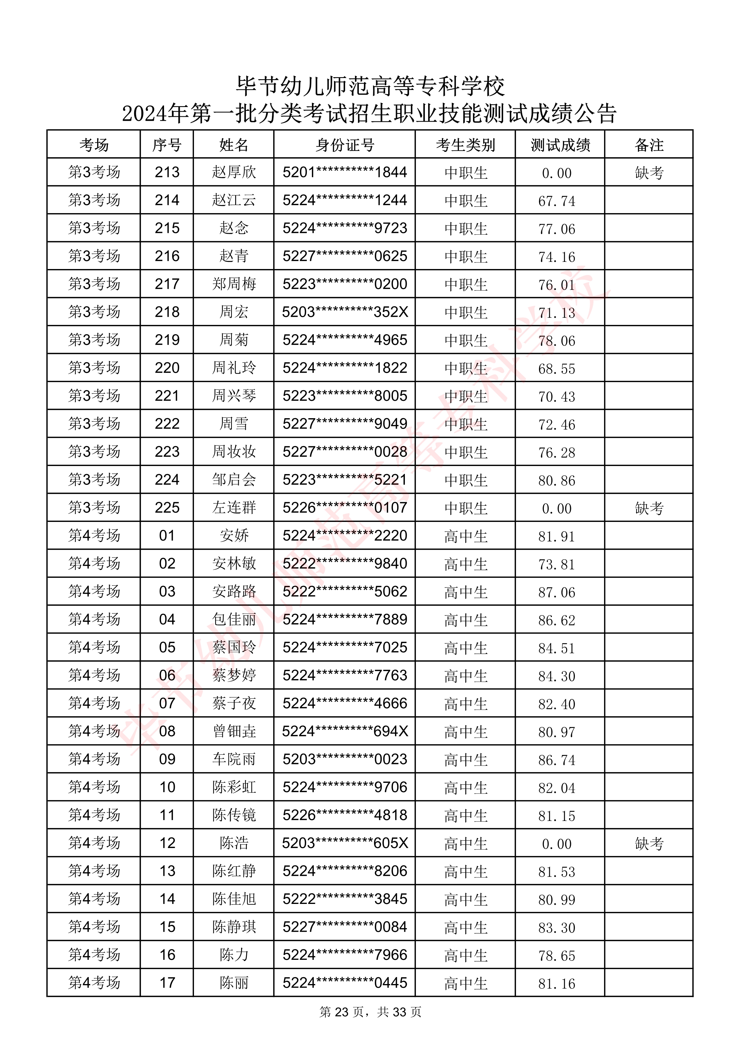 毕节幼儿师范高等专科学校2024年第一批分类考试招生职业技能测试成绩公告