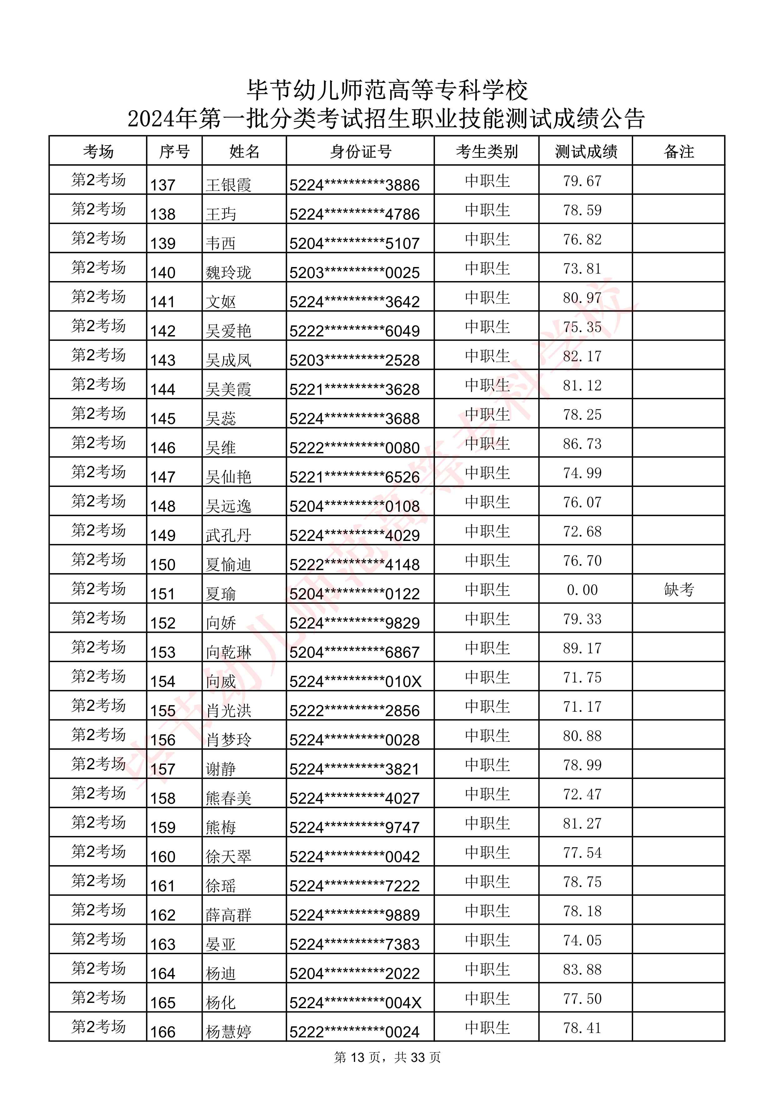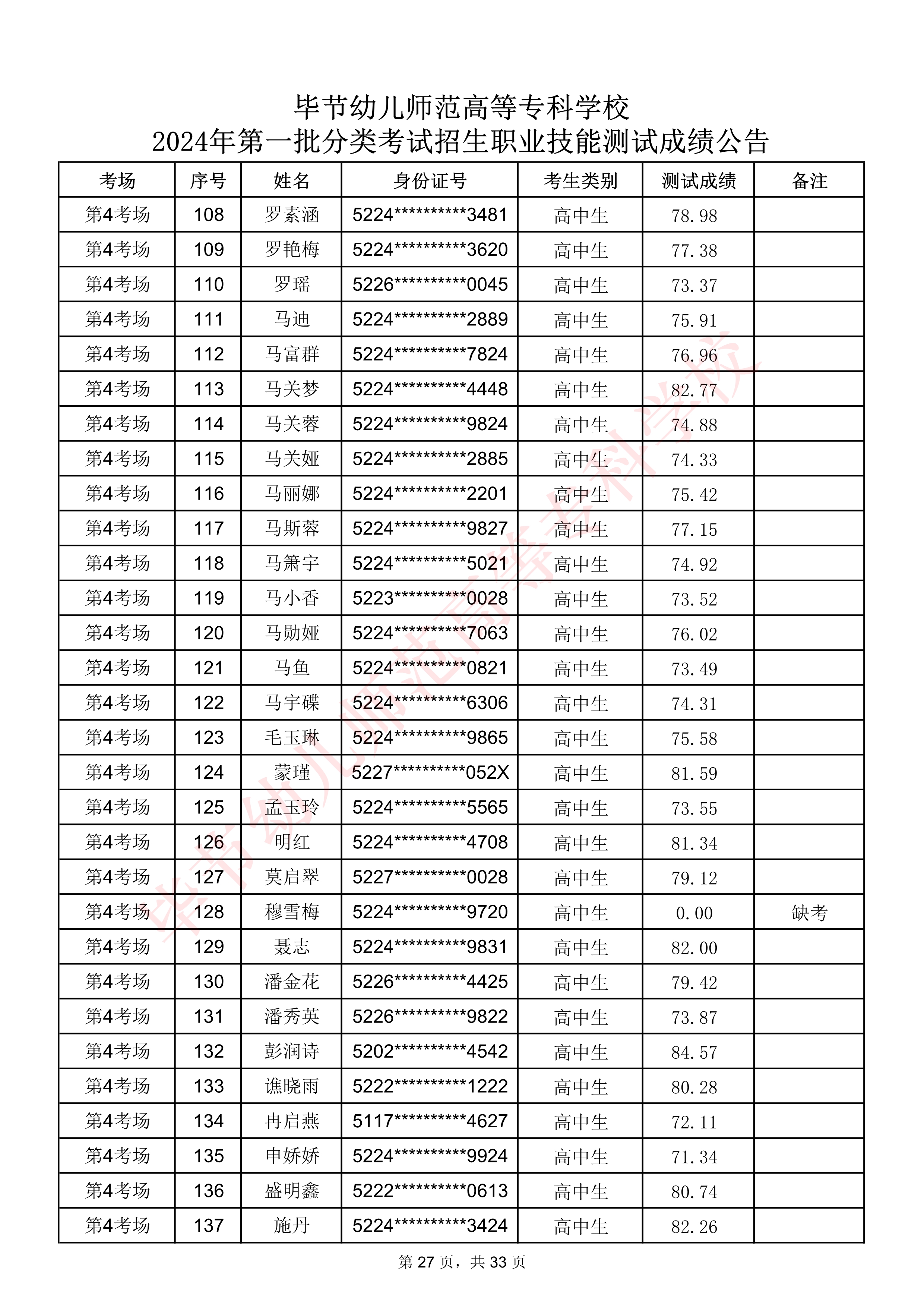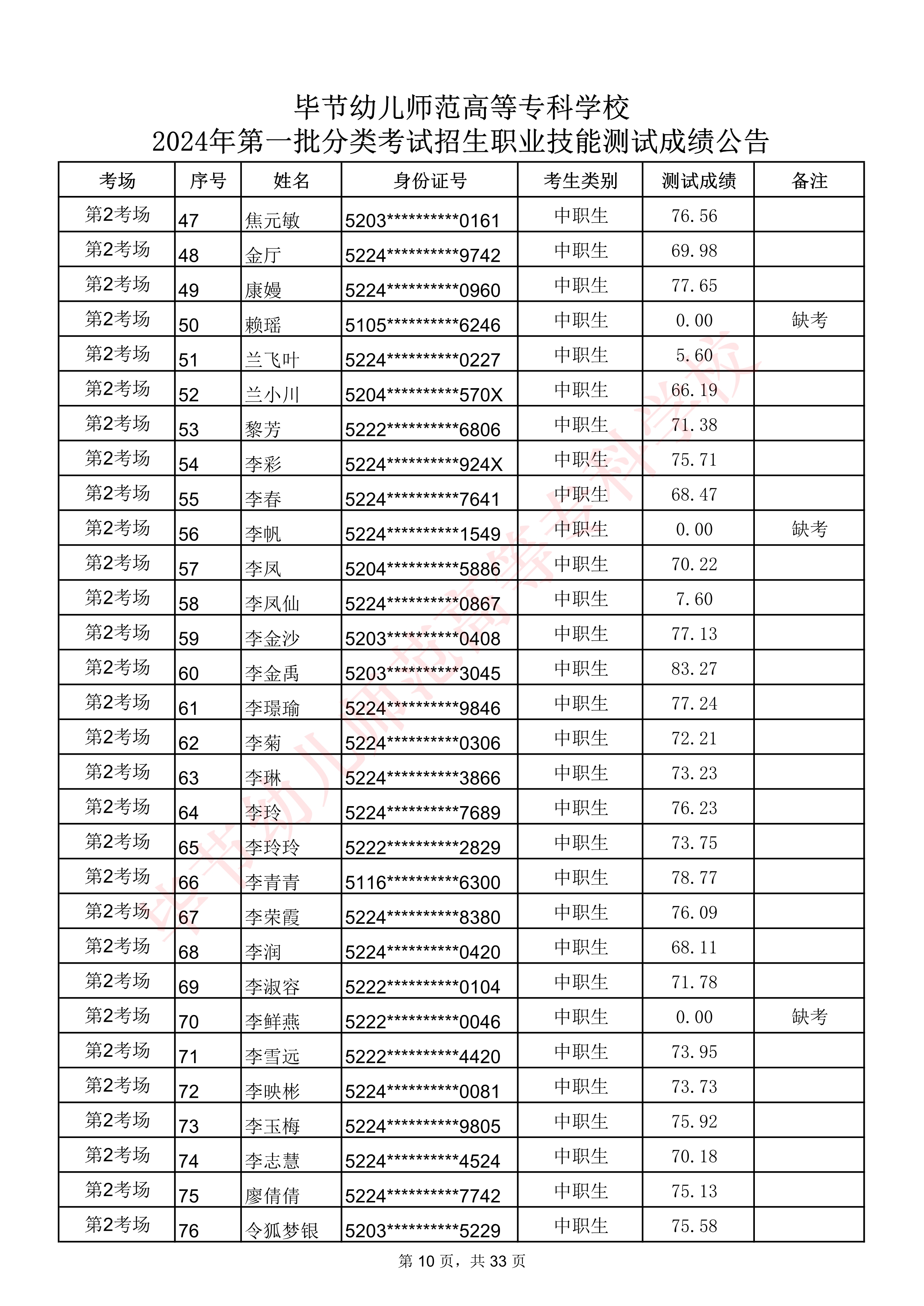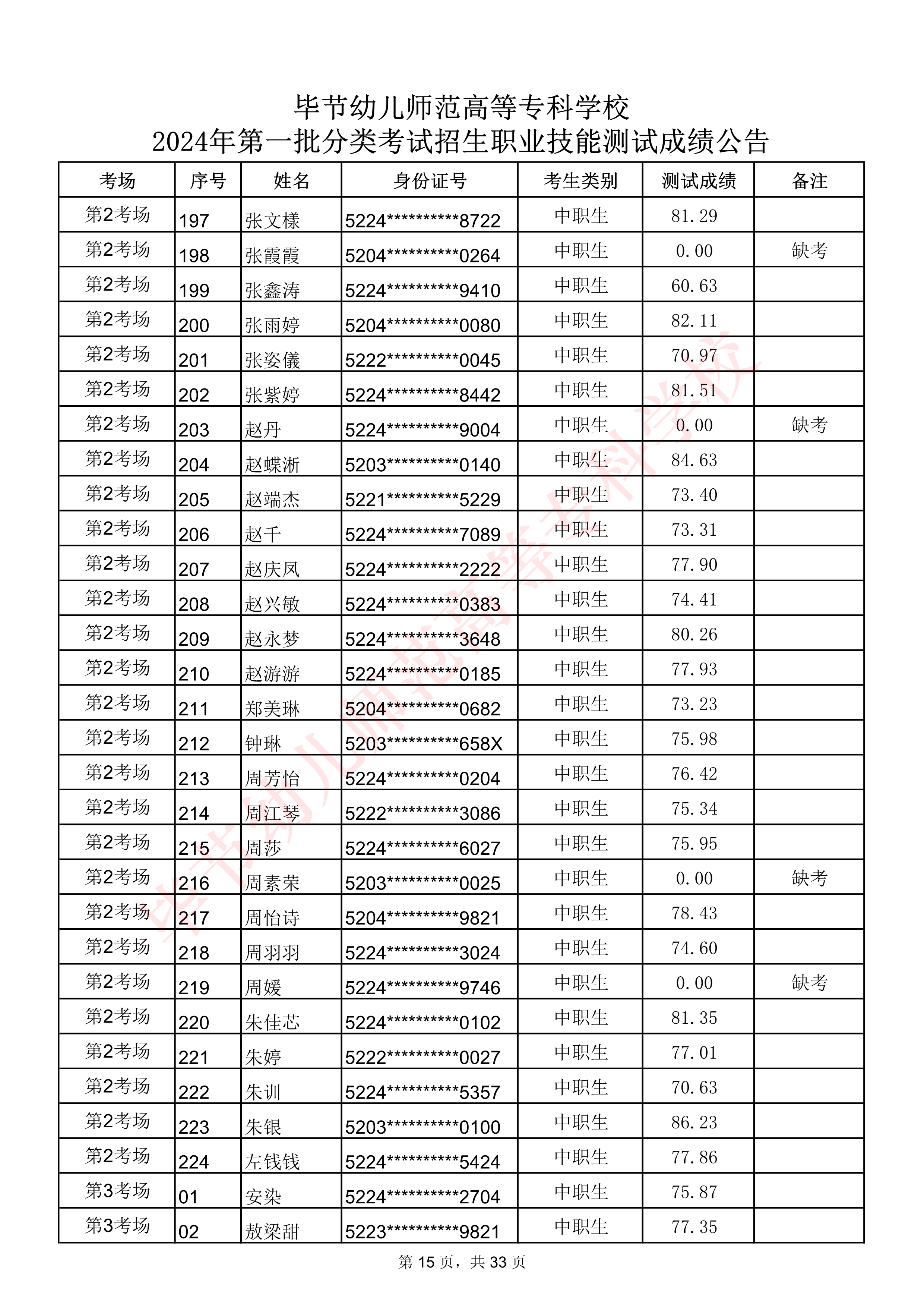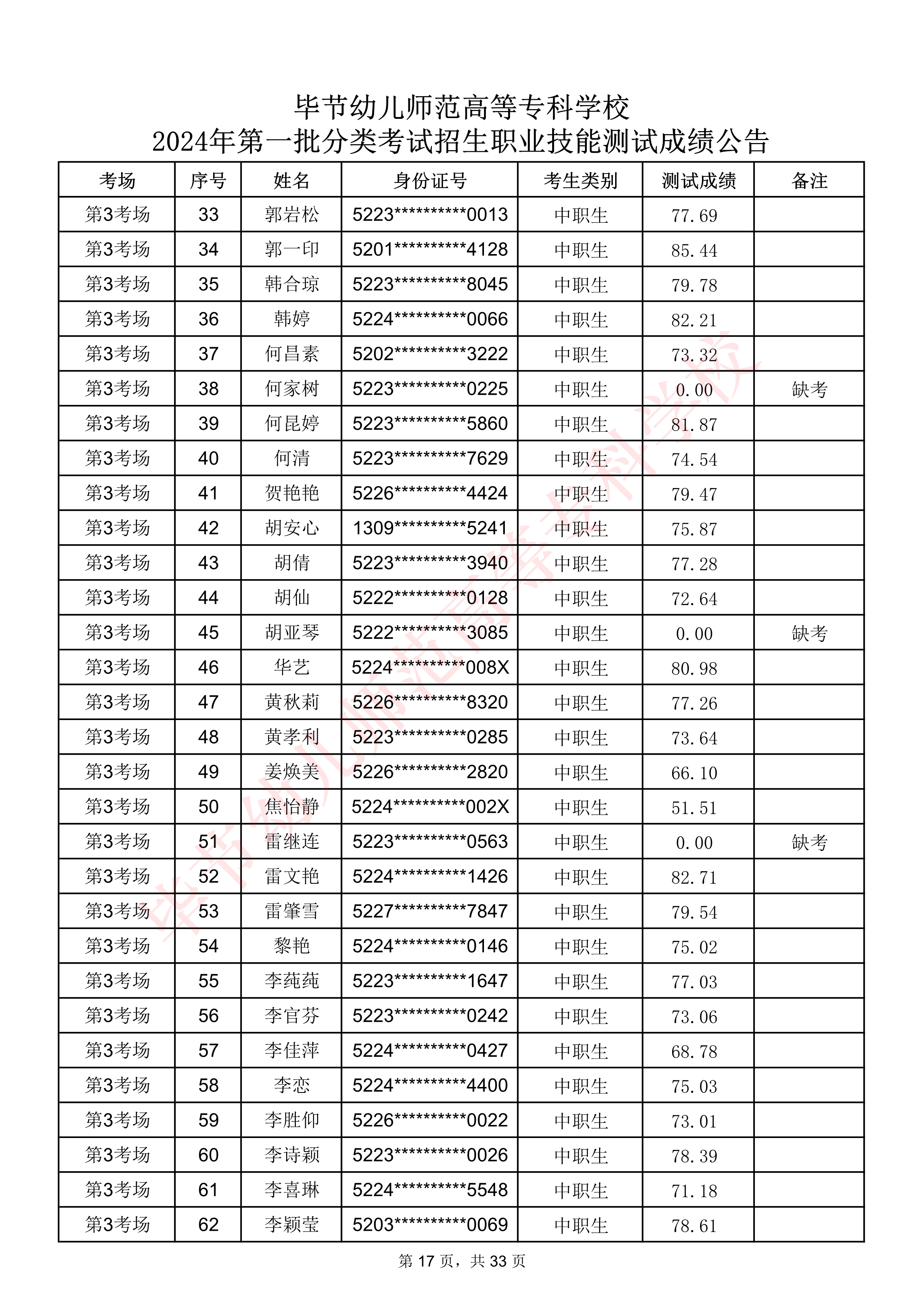 毕节幼儿师范高等专科学校2024年第一批分类考试招生职业技能测试成绩公告