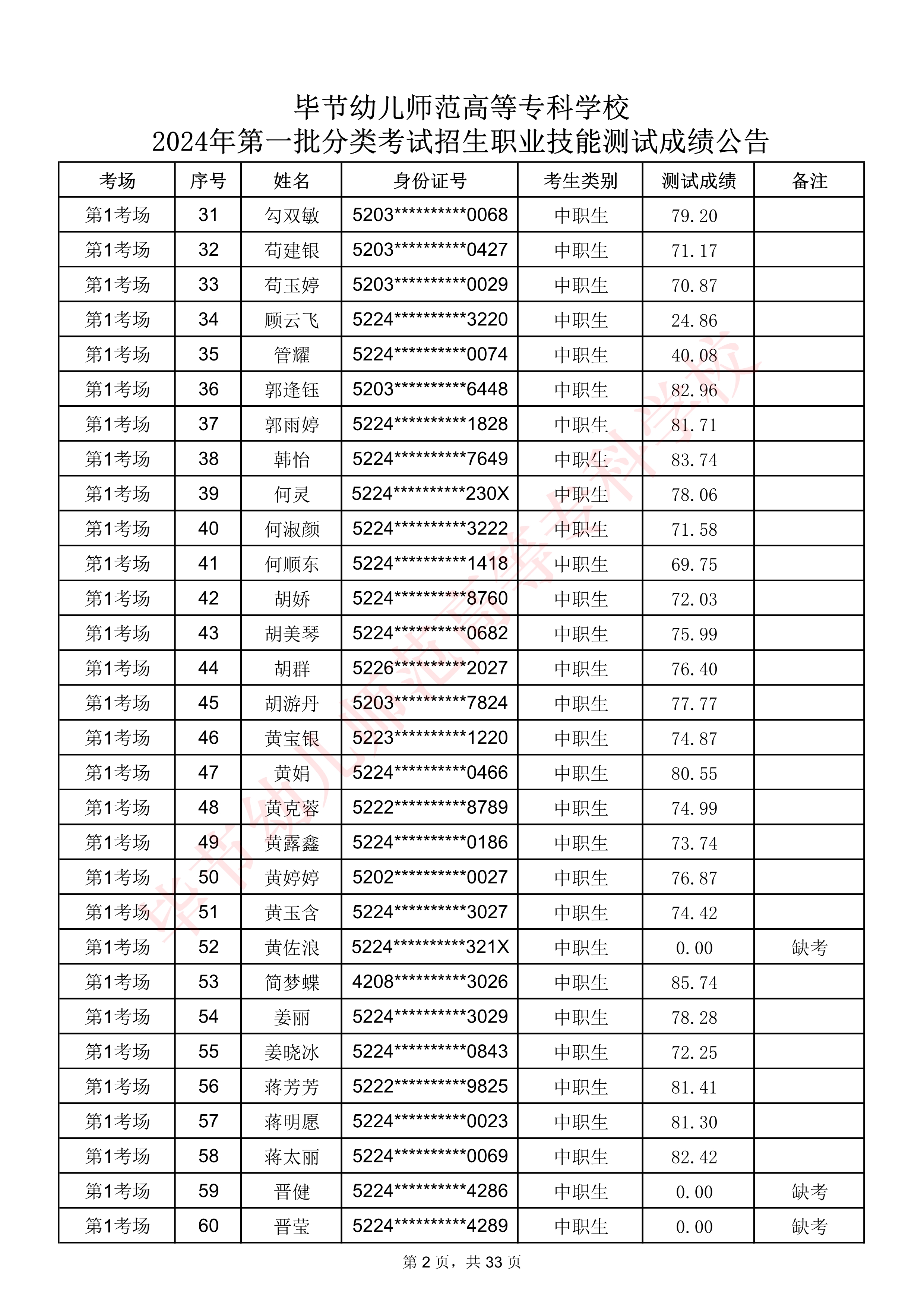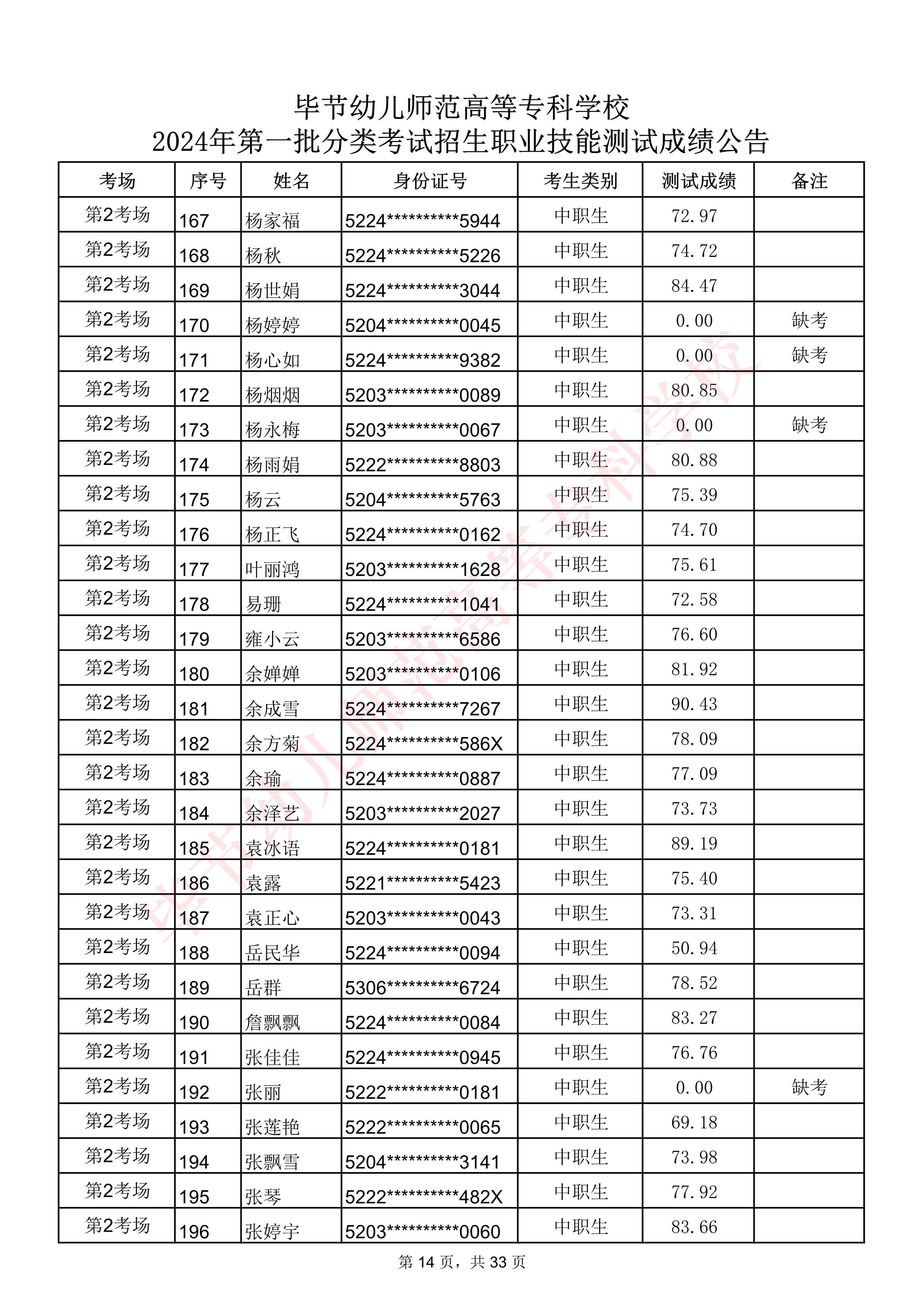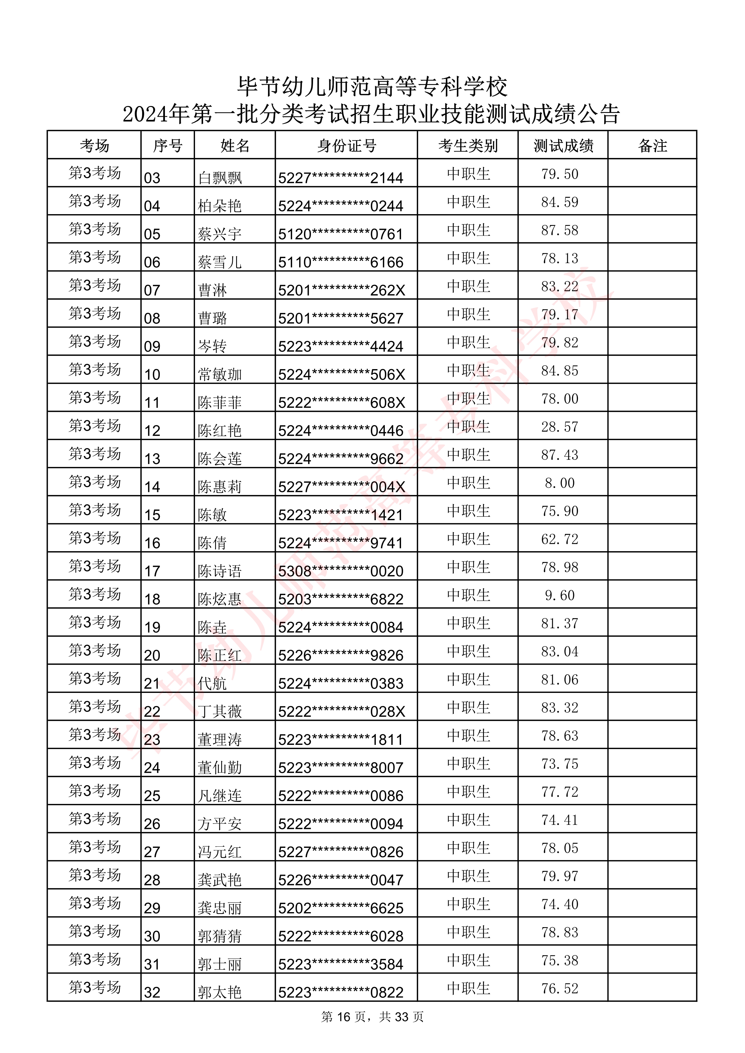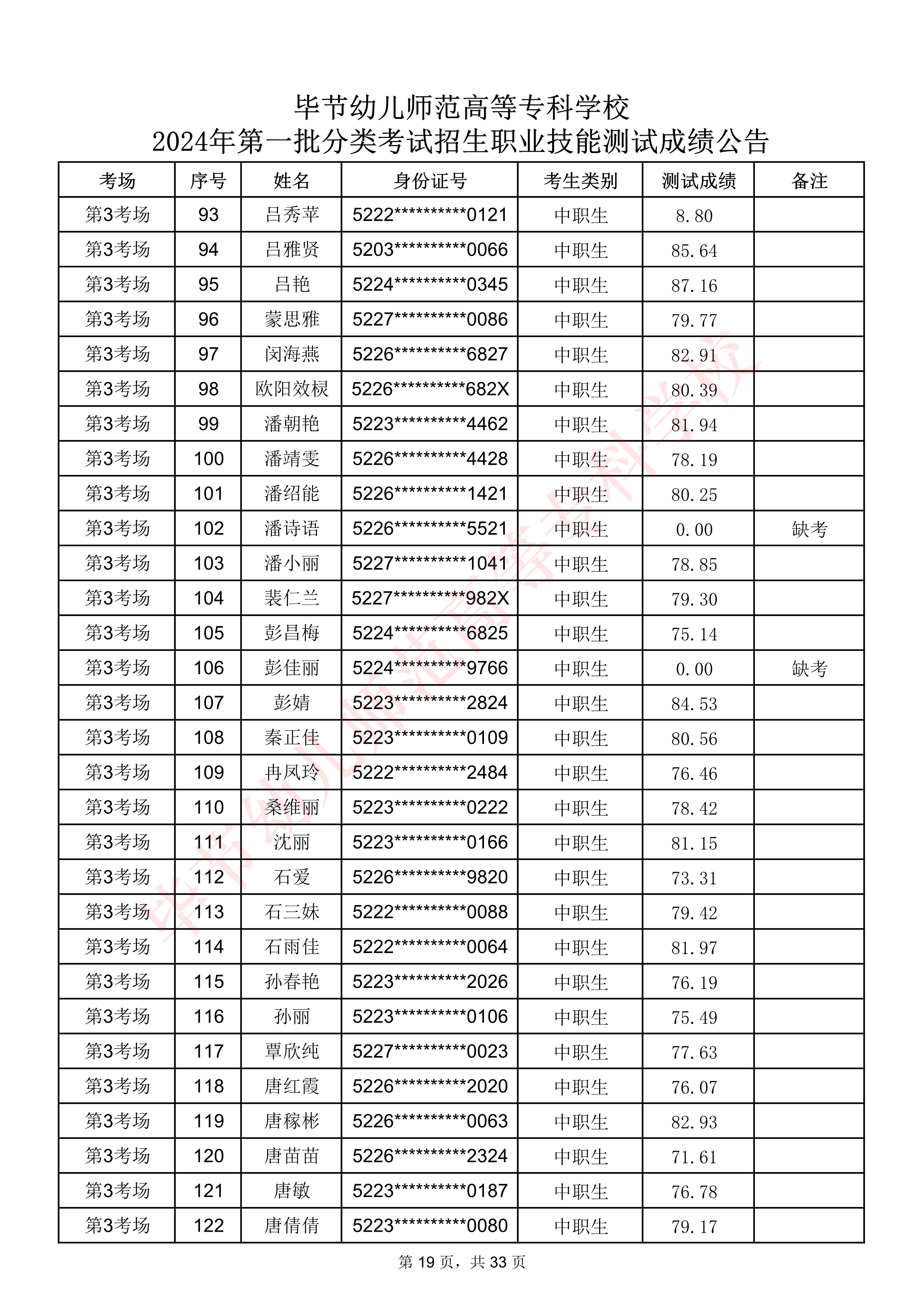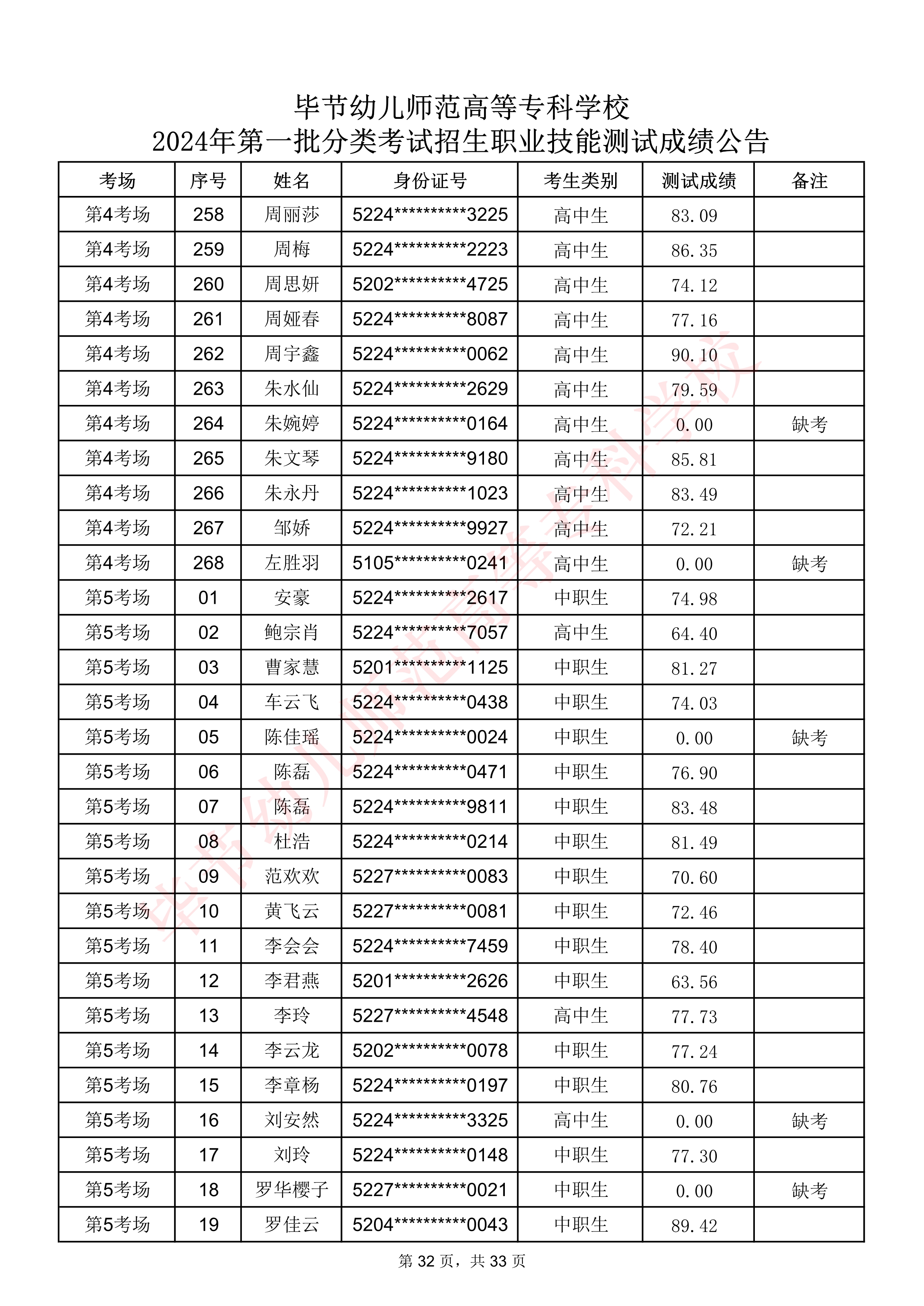 毕节幼儿师范高等专科学校2024年第一批分类考试招生职业技能测试成绩公告
