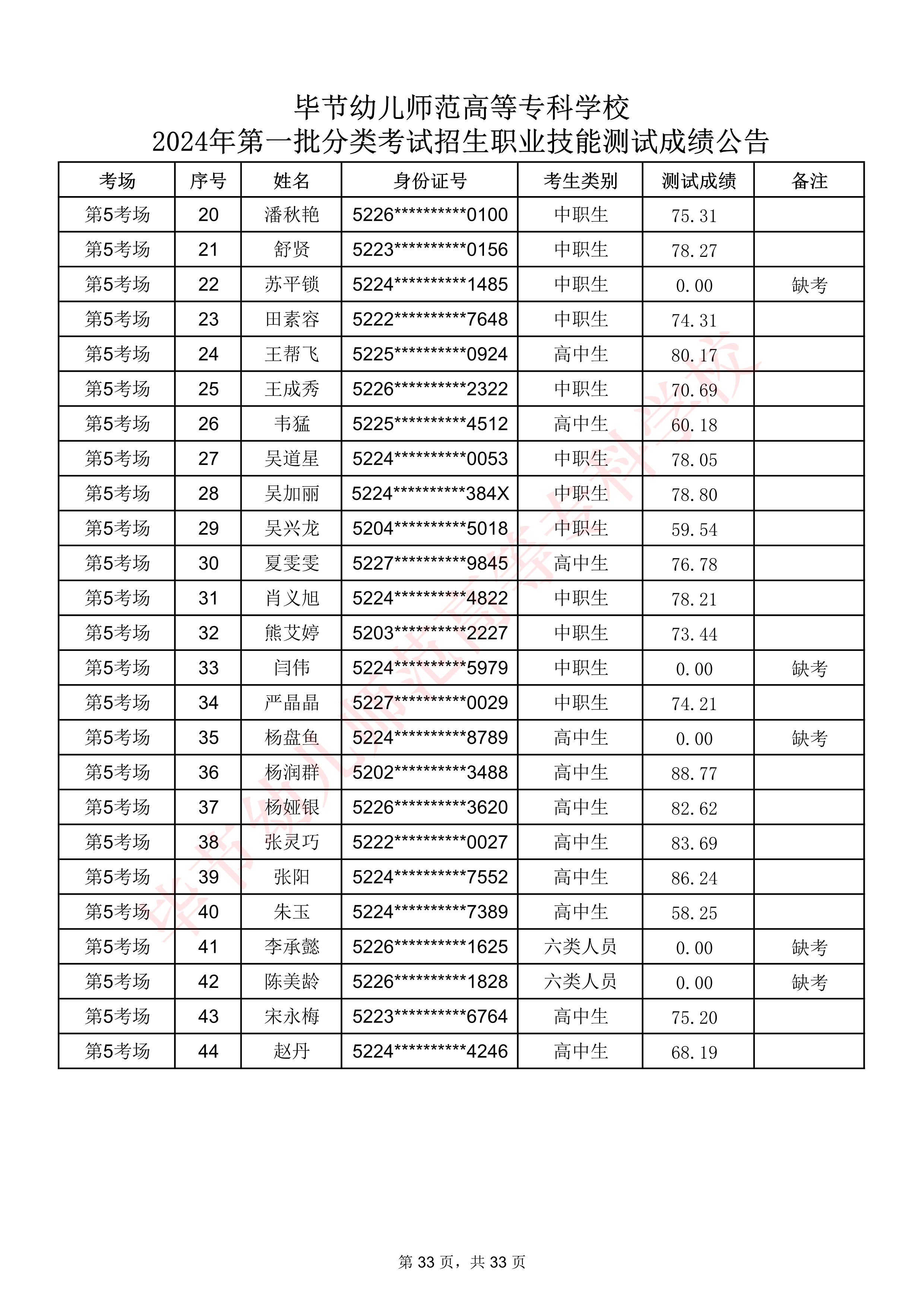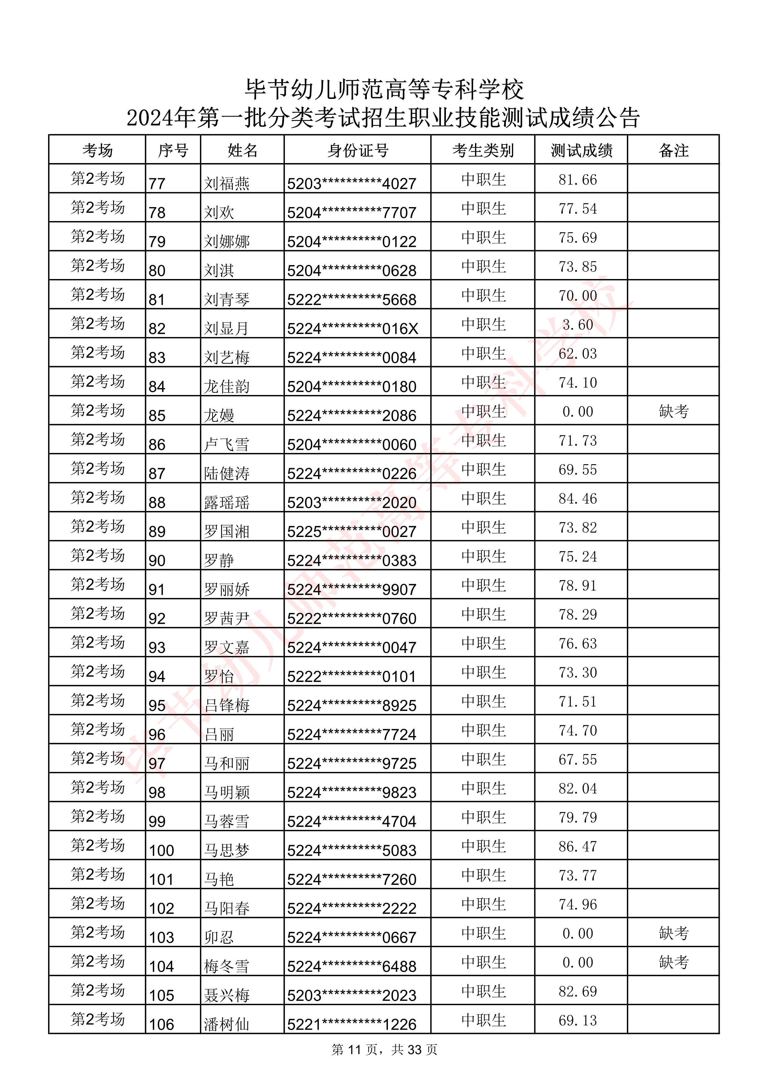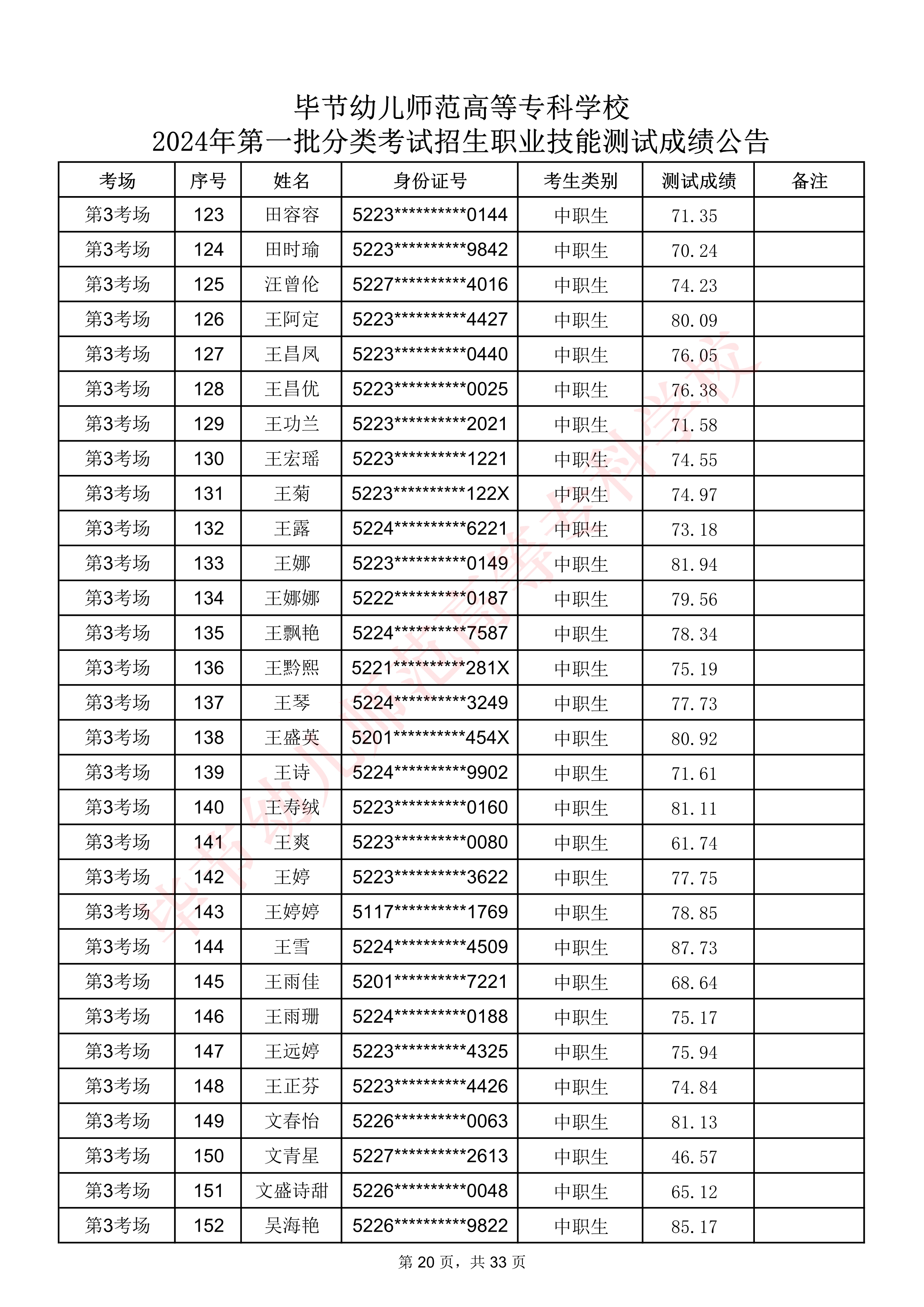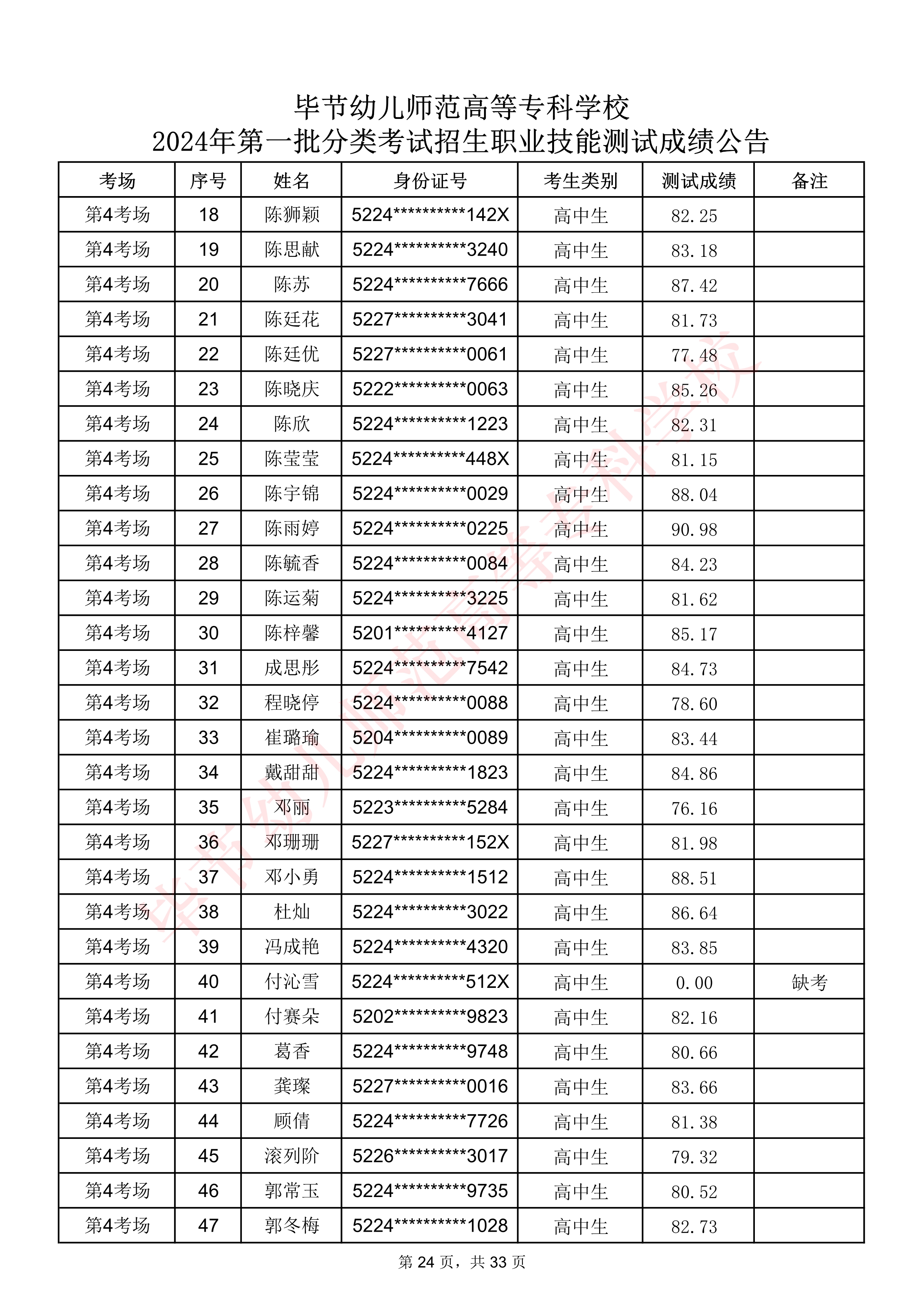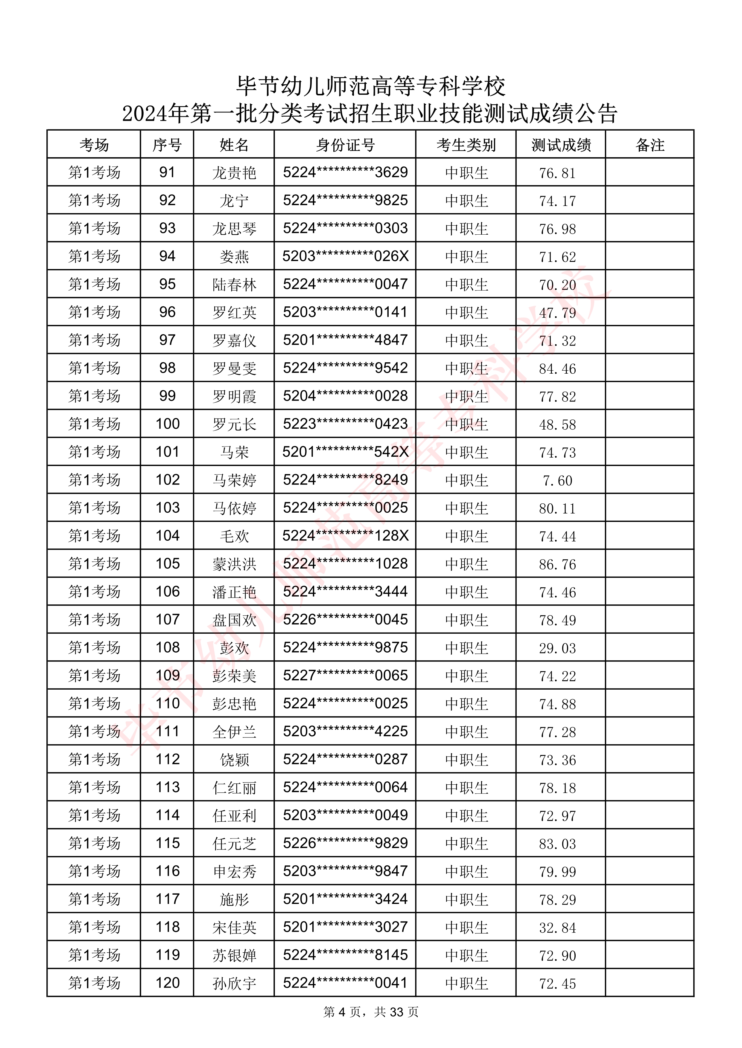 毕节幼儿师范高等专科学校2024年第一批分类考试招生职业技能测试成绩公告